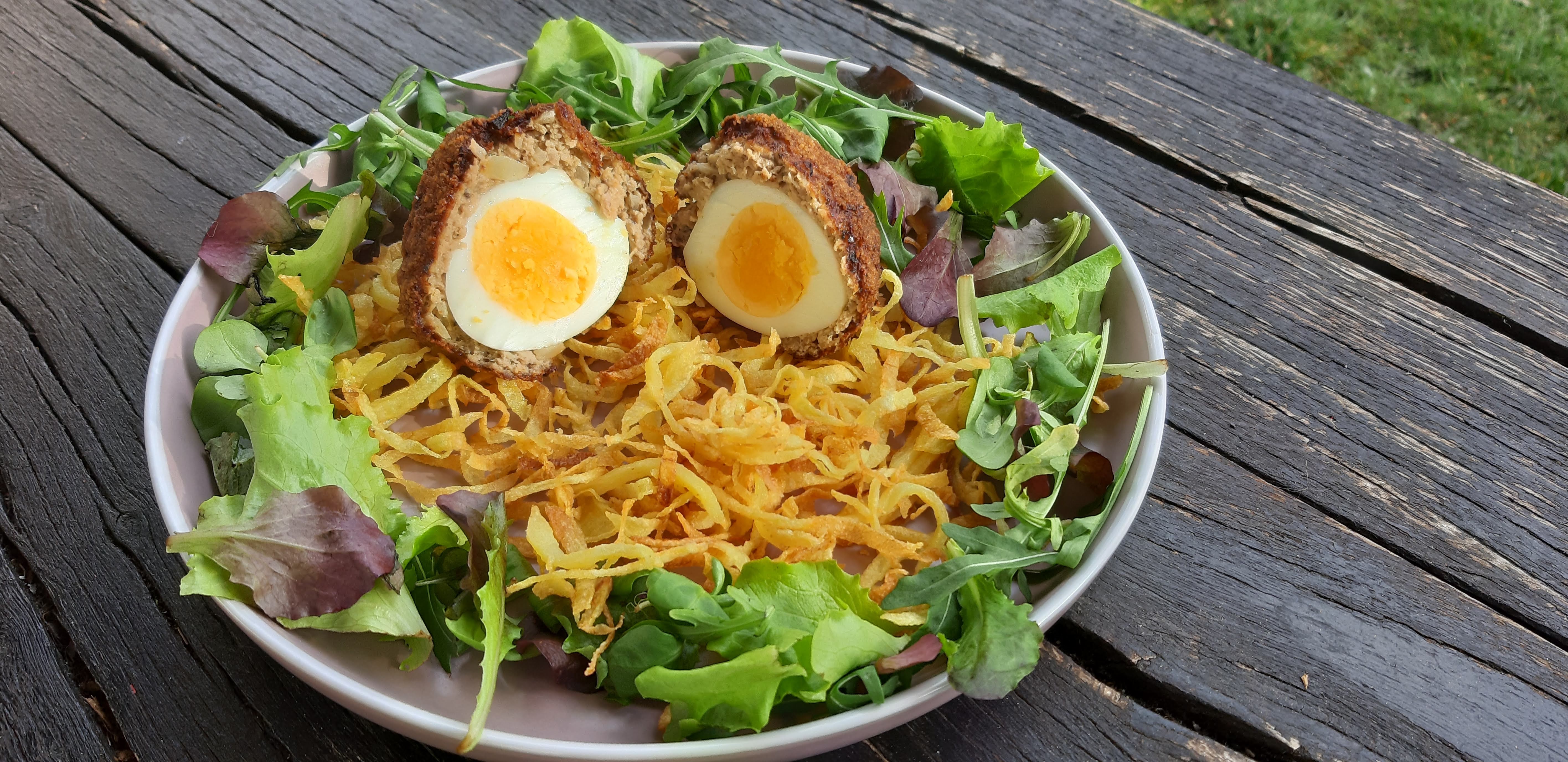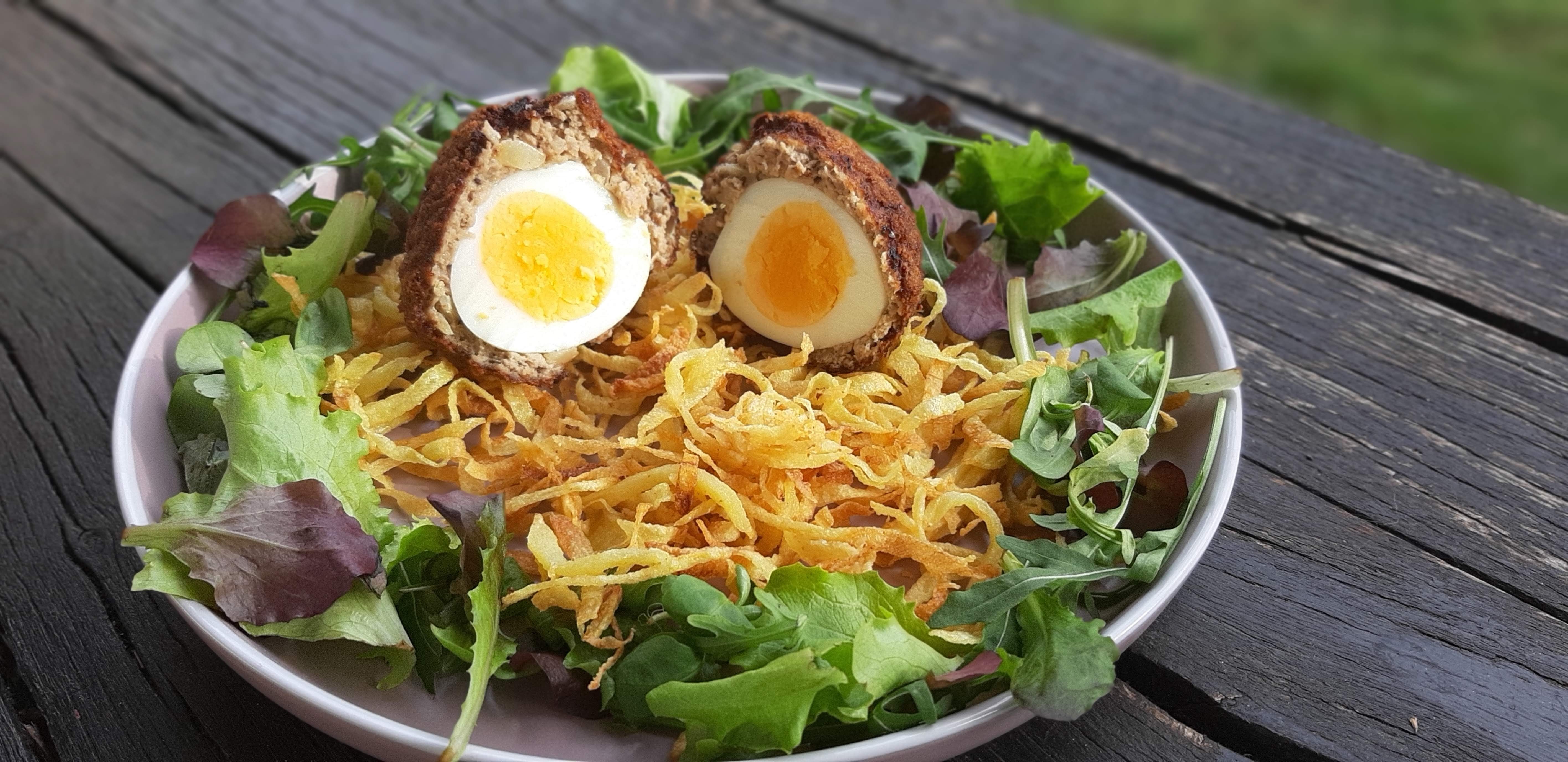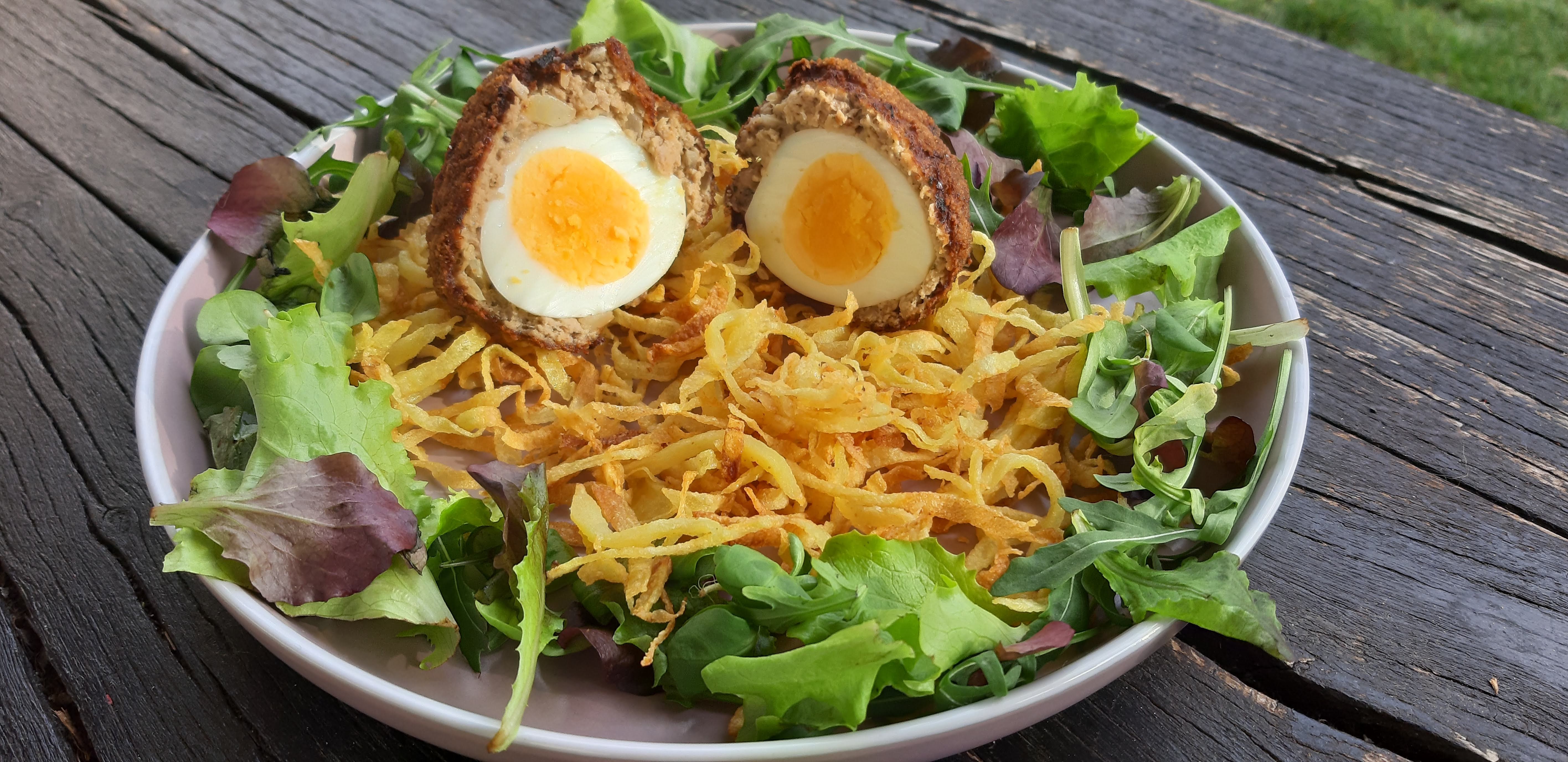 - Разделям каймата на 4 равни части и увивам яйцата с нея.