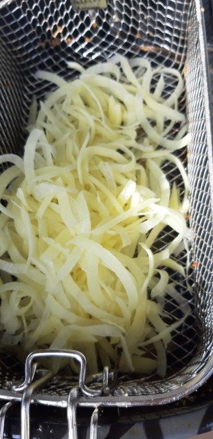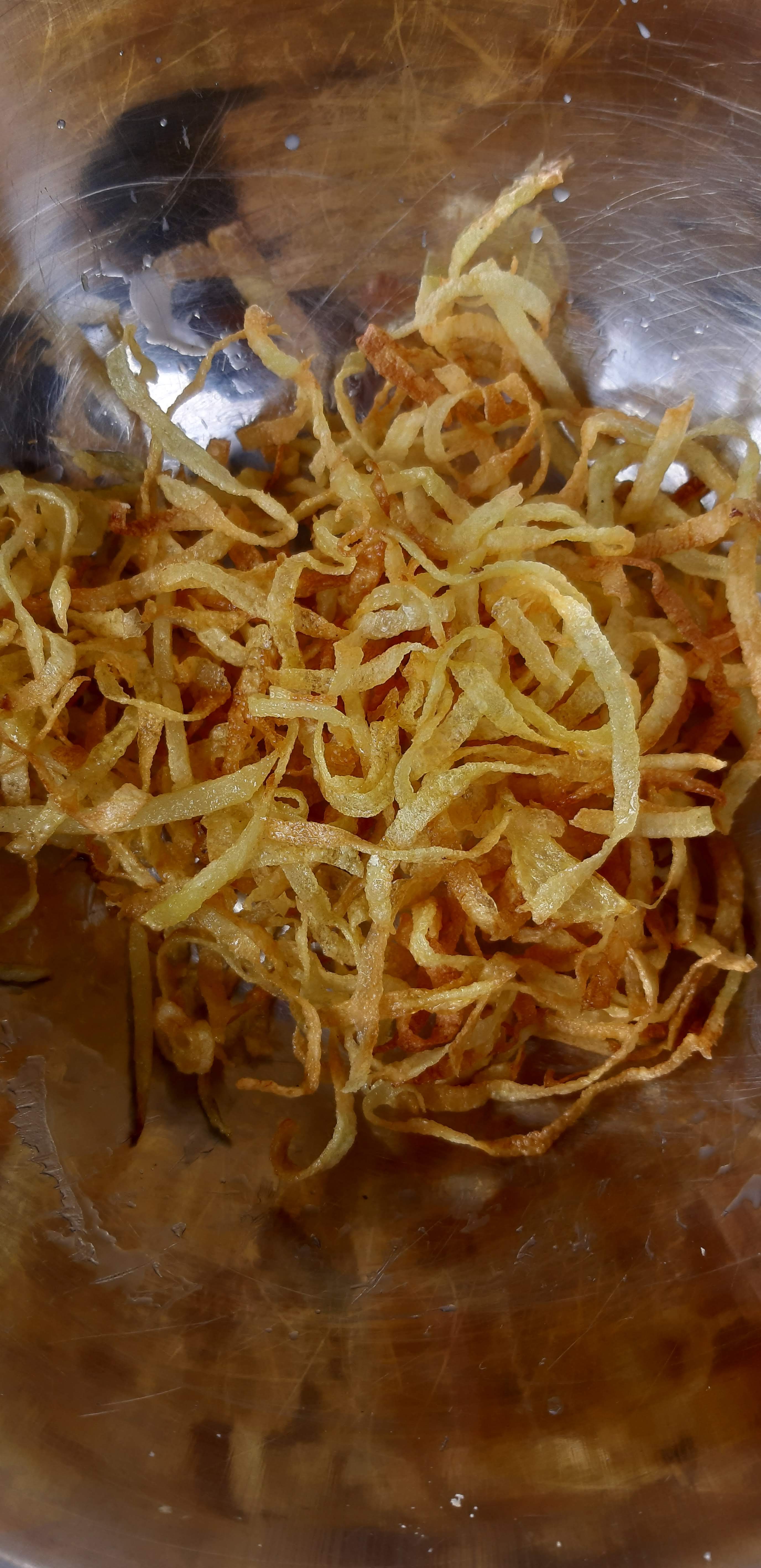 - Започвам от направата на картофената слама или докато мазнината за пържене е още чиста.