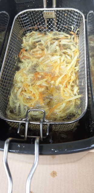- Загрявам мазнината до 180 градуса и пържа картофената слама около 2 минути или до златисто оцветяване.