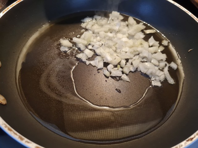 • Загрявам мазнината и изпържвам в нея за кратко нарязания на ситно кромид лук и скилидките чесън.