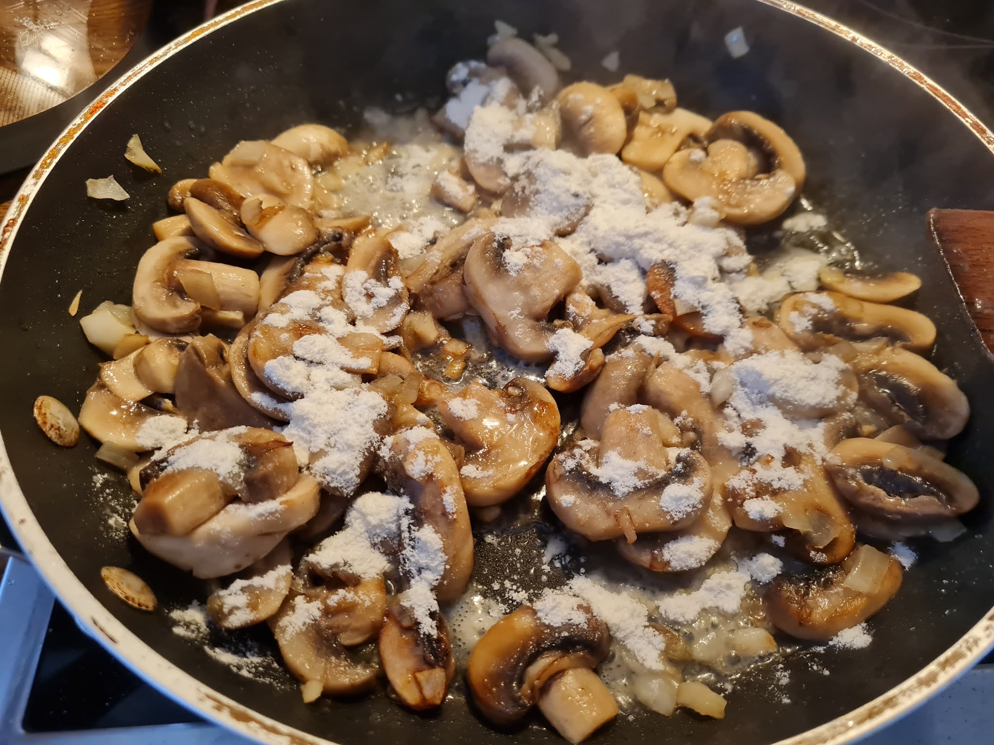 • Поръсвам всичко с брашното и пържа съвсем кратко като не спирам да разбърквам.