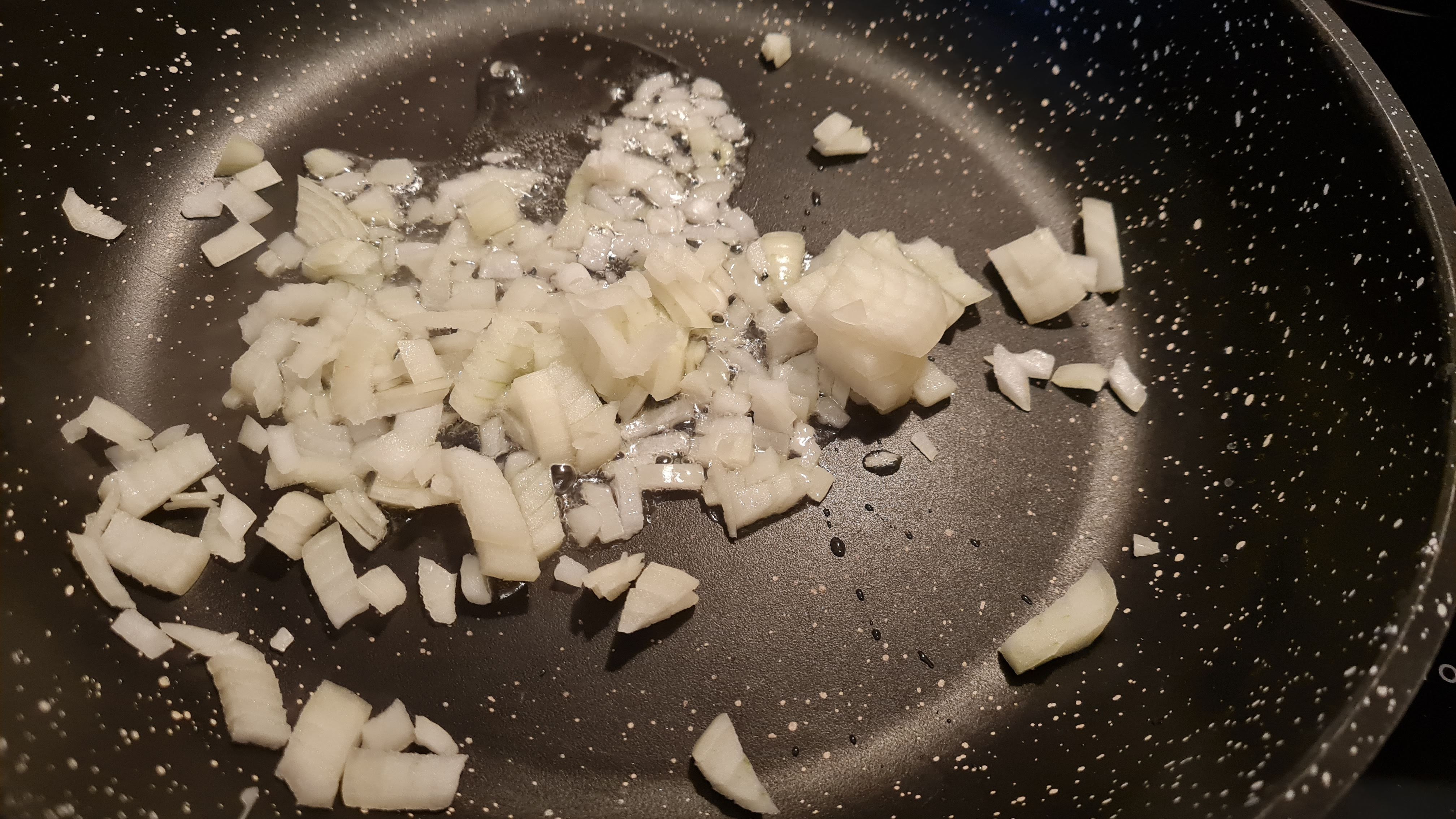 - Загрявам мазнината в тиган и изпържвам за кратко нарязания на ситно кромид лук.