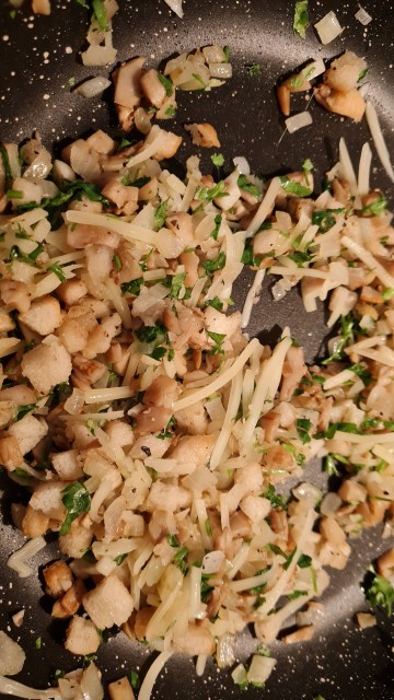 - Прибавям натрошения на трохи хляб, счукания чесън, ситно нарязания магданоз и черия пипер.