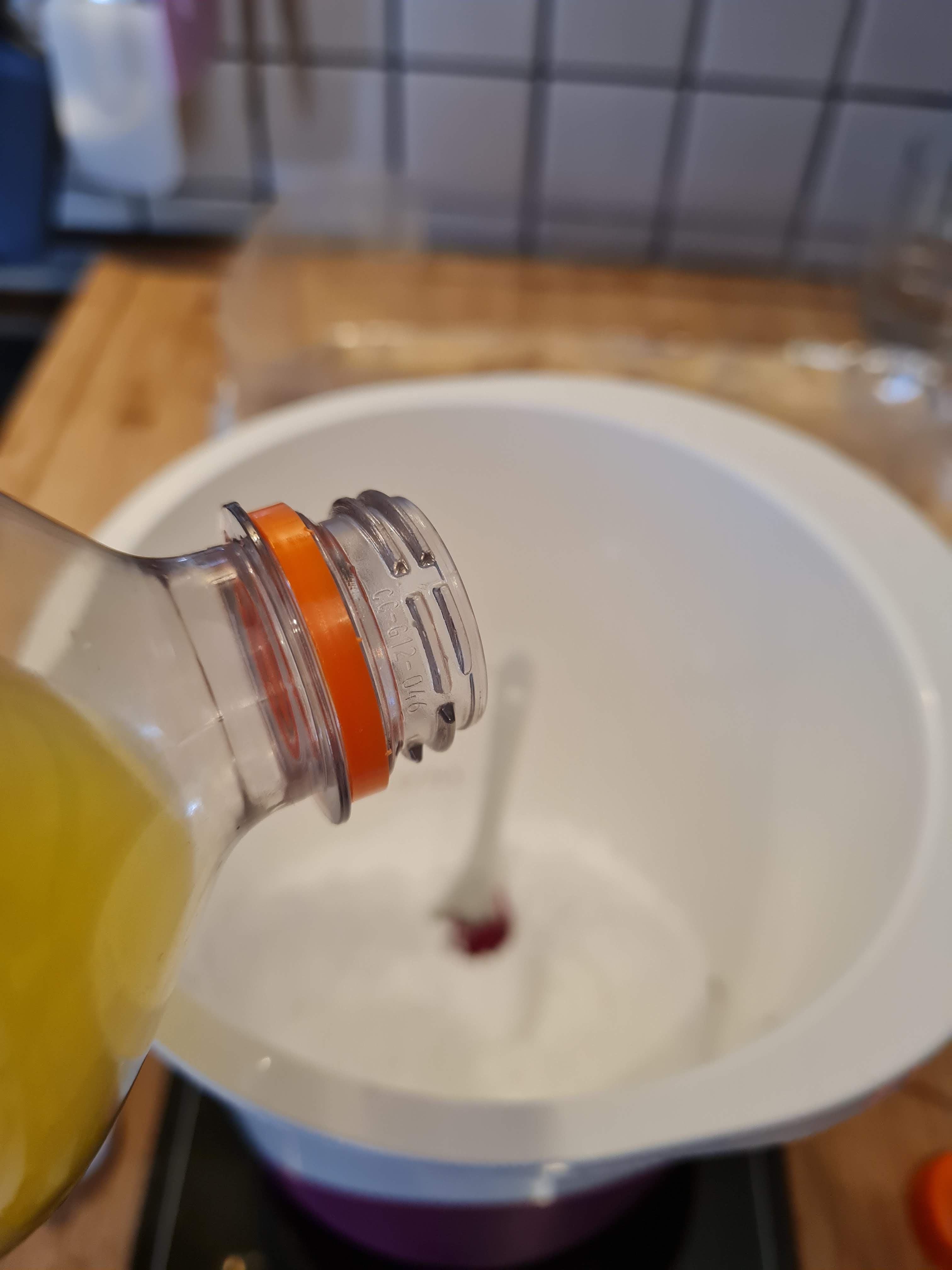 • Пудрата захар смесвам с фанта и малко оранжева боя до получаването на гъста глазура.
