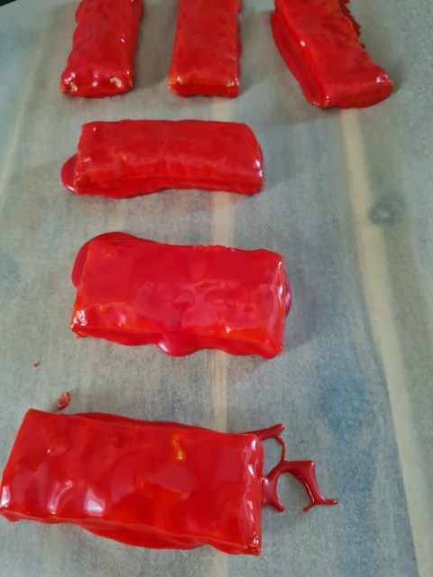 • С оранжевата глазура намазвам тези продълговати парчета от изпеченото тесто.