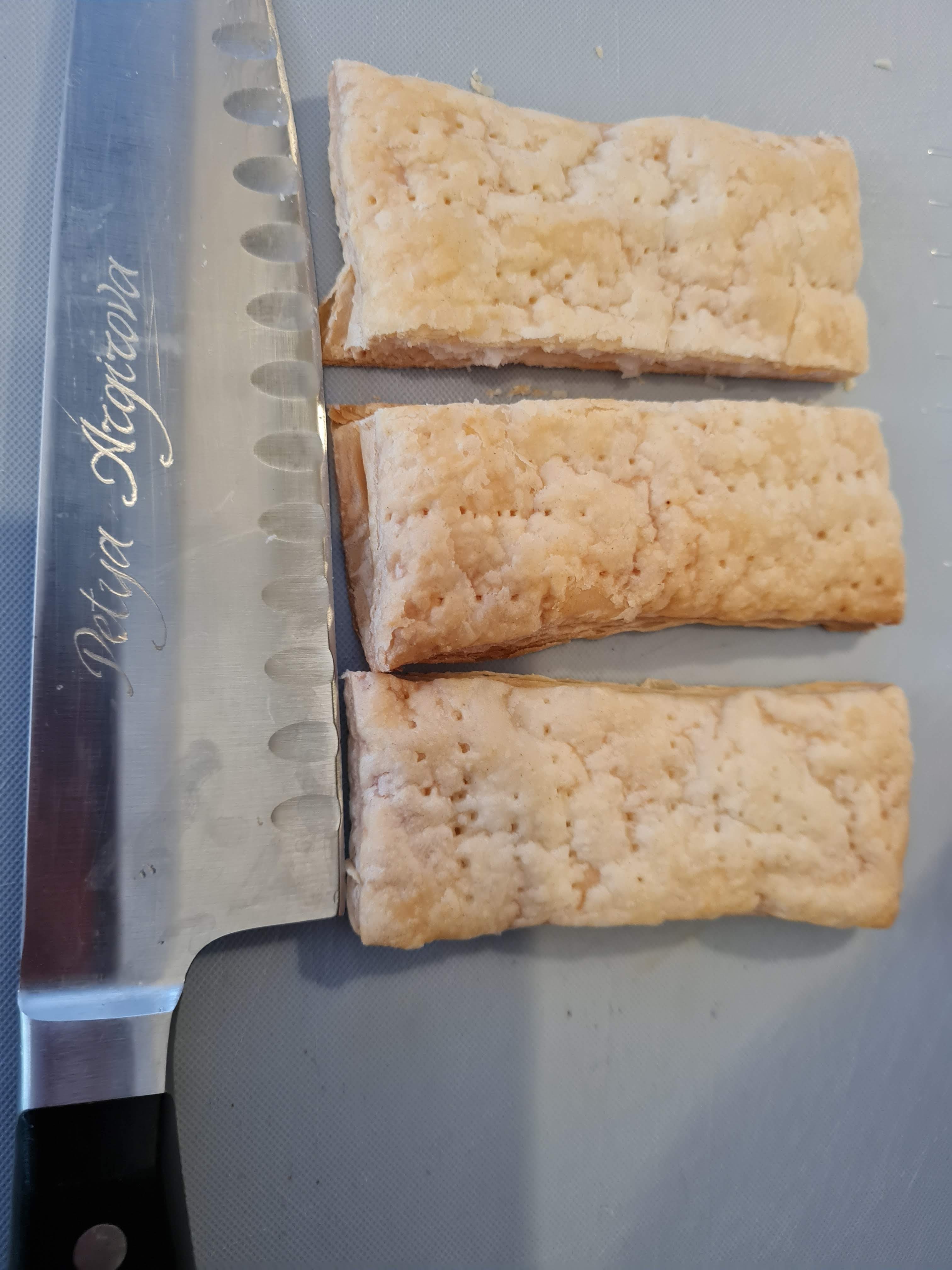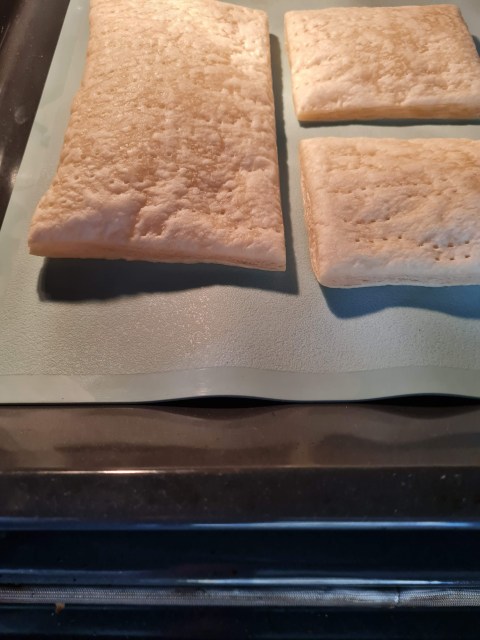 • Изваждам тестото от фризера и оставм спокойно за час – два да се размрази. Хубавото на немското маслено или многолистно тесто, което е от фризер, че е на малки продълговаи листа, които много лесно се подготвят за този сладкиш.