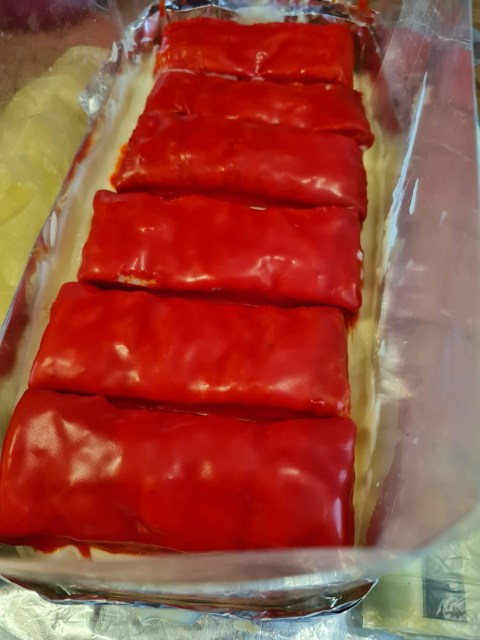 • За мое улеснение, тестото което ще е оцветено в оранжево, режа предварително на порции. Но може и после да се направи. Това е въпрос на Ваше желание.