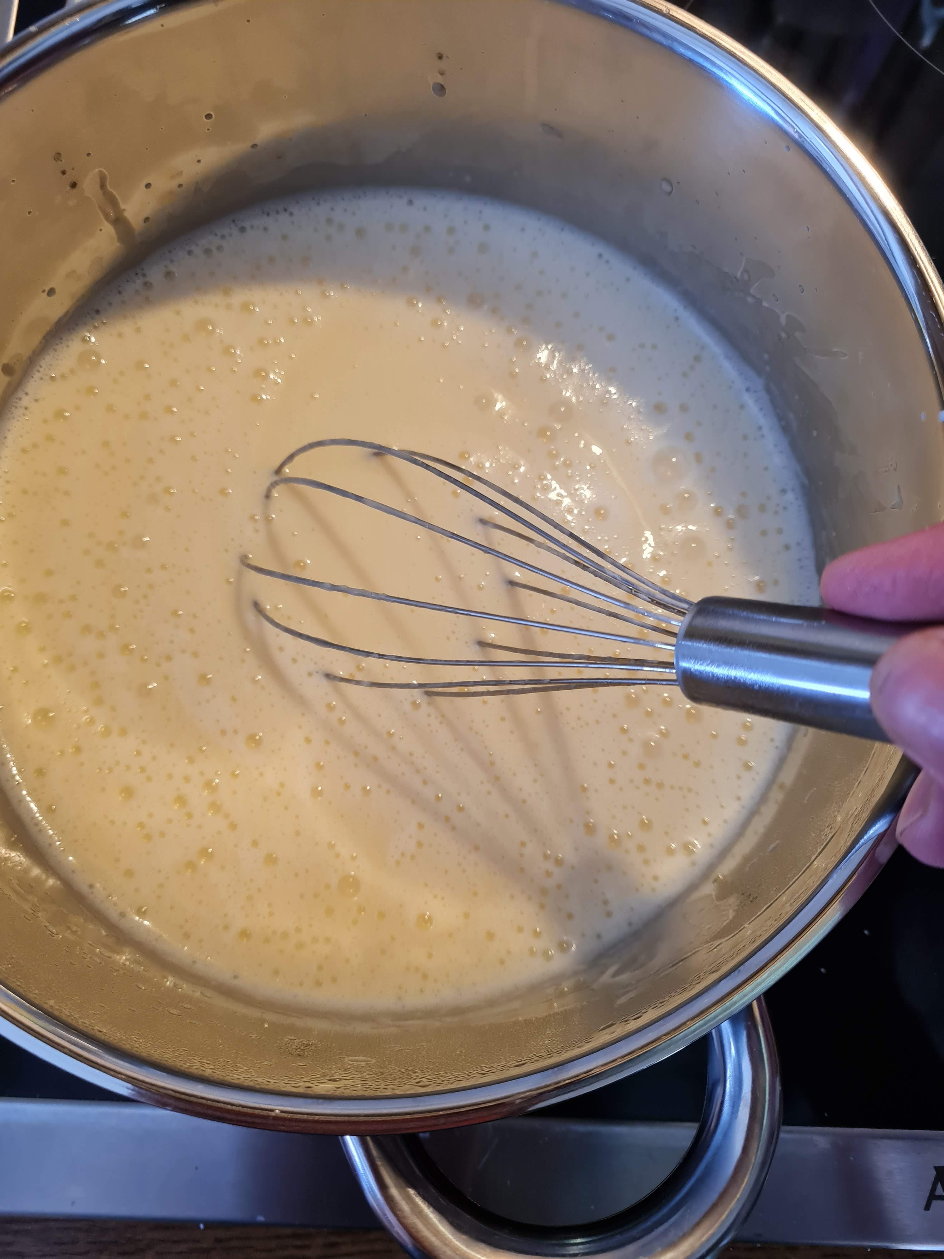 • Намалявам котлона и на тънка струя добавям към млякото яйчената смес.