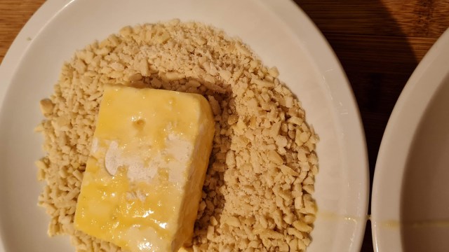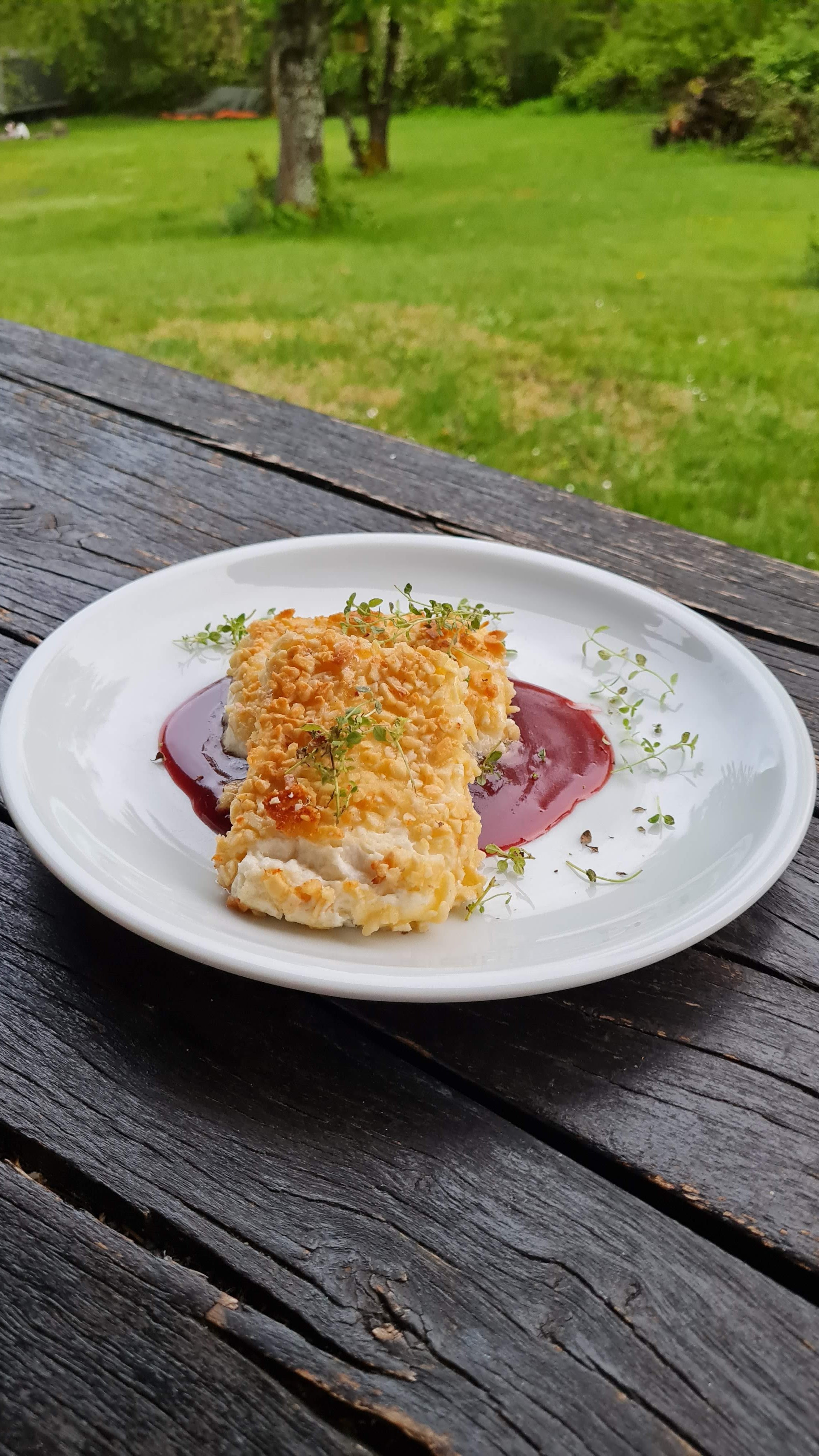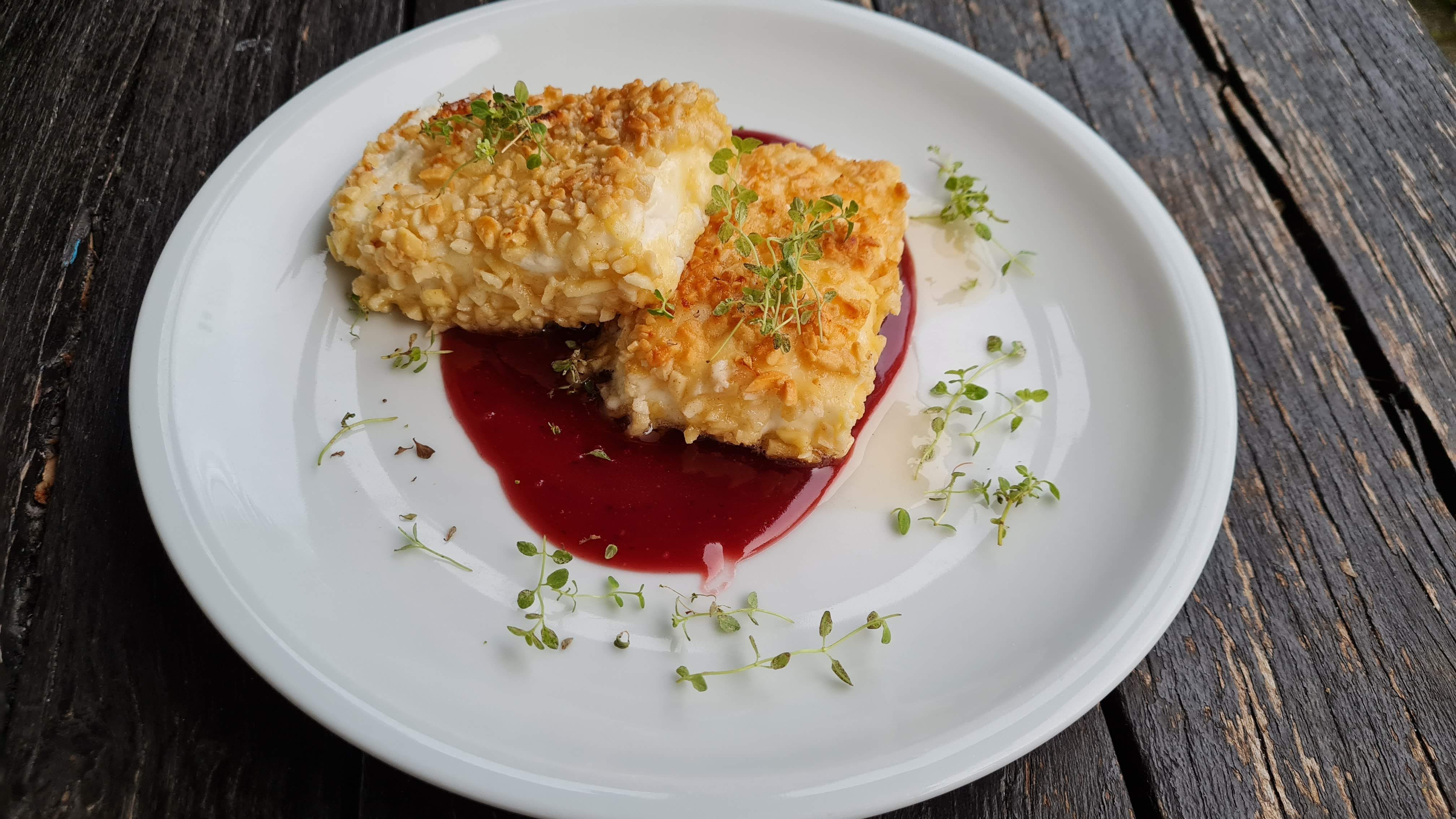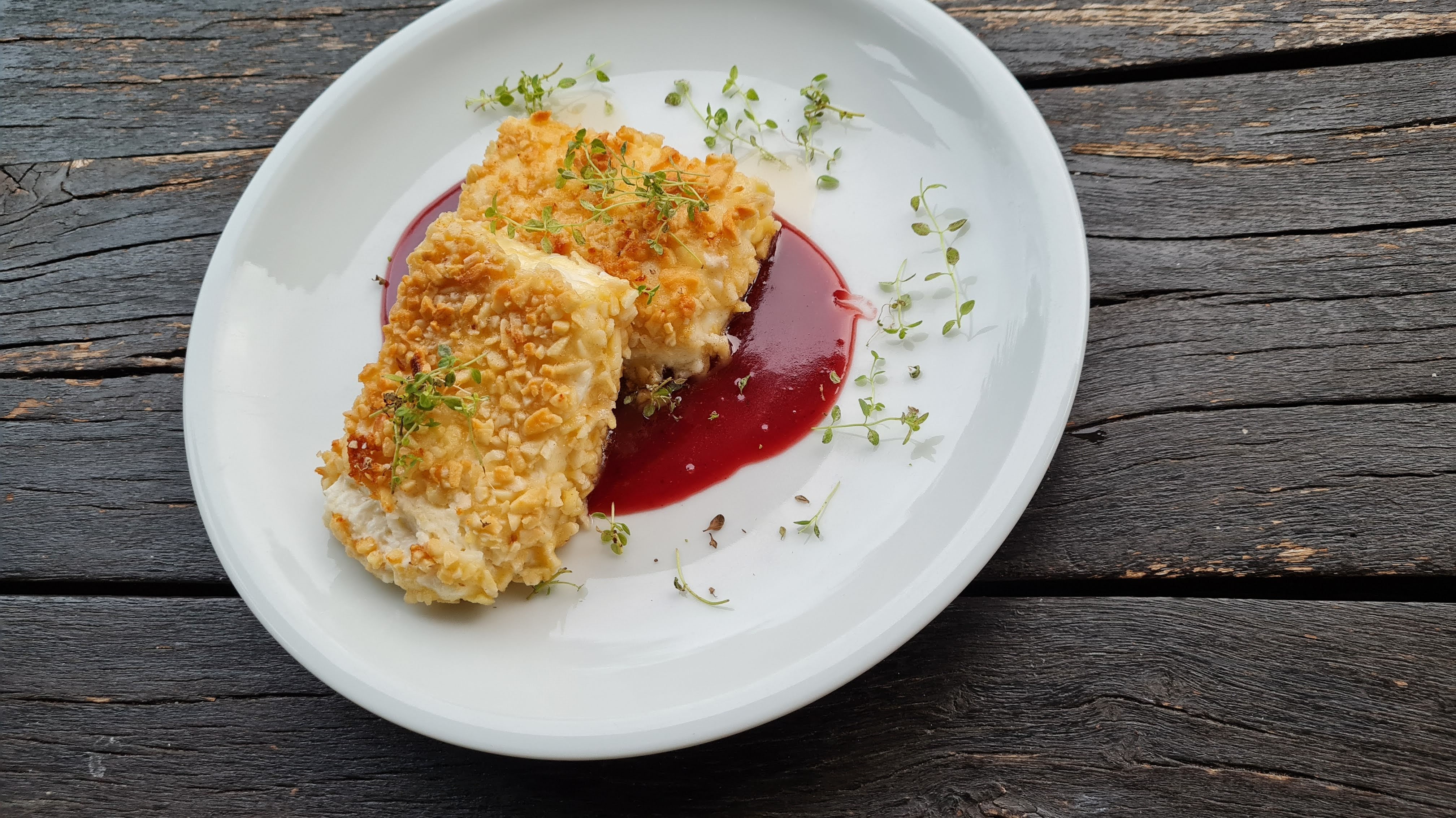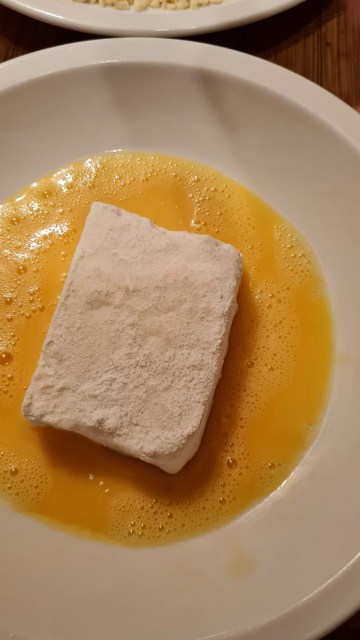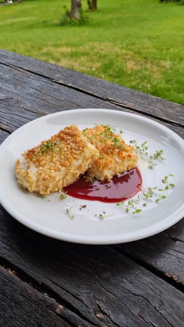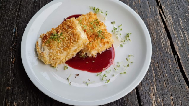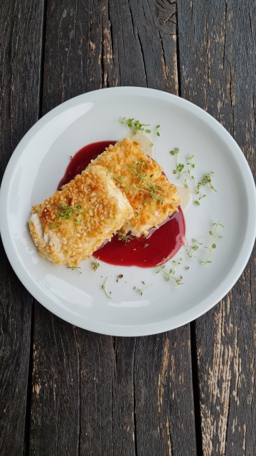 - Сервирам панираното фета сирене върху вкусния сладко-кисел сос, като прясна франзела му прави идеална компания, заедно със зелена салата.