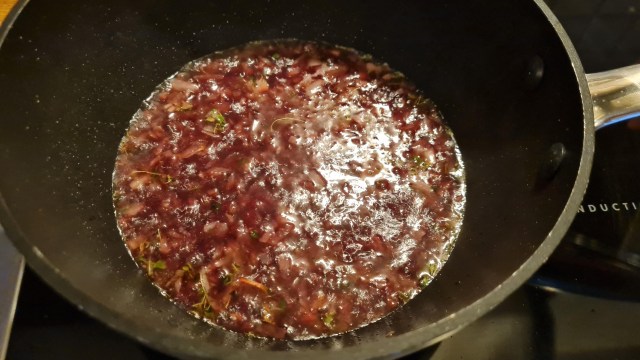 - Заливам с виното и оставям за 5 минути на средна мощност да поври.