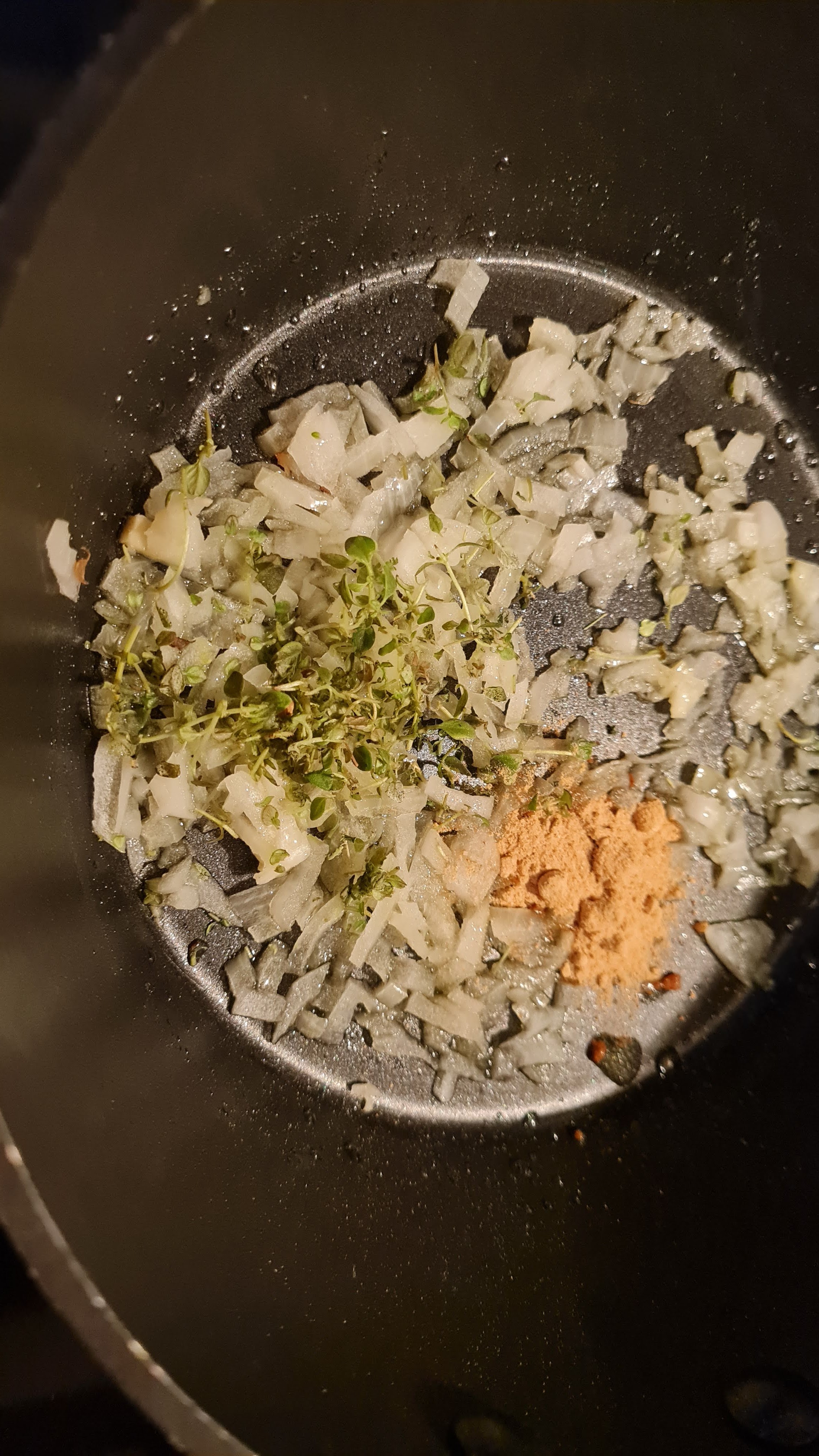 - Загрявам маслото и изпържвам нарязания на ситно шалот, заедно с мащерката и джинджифила.