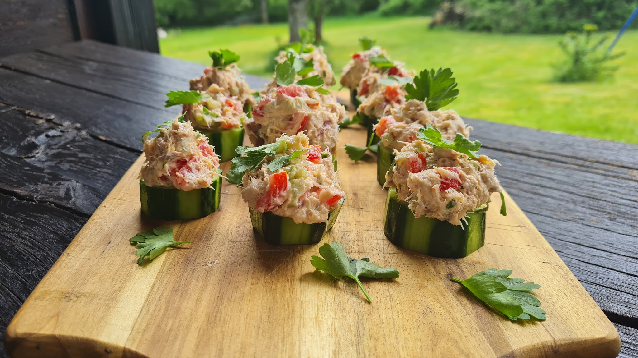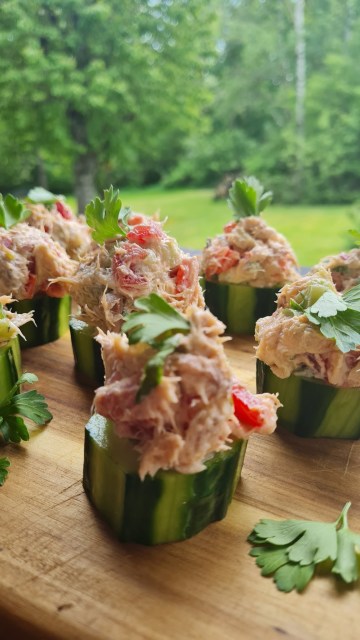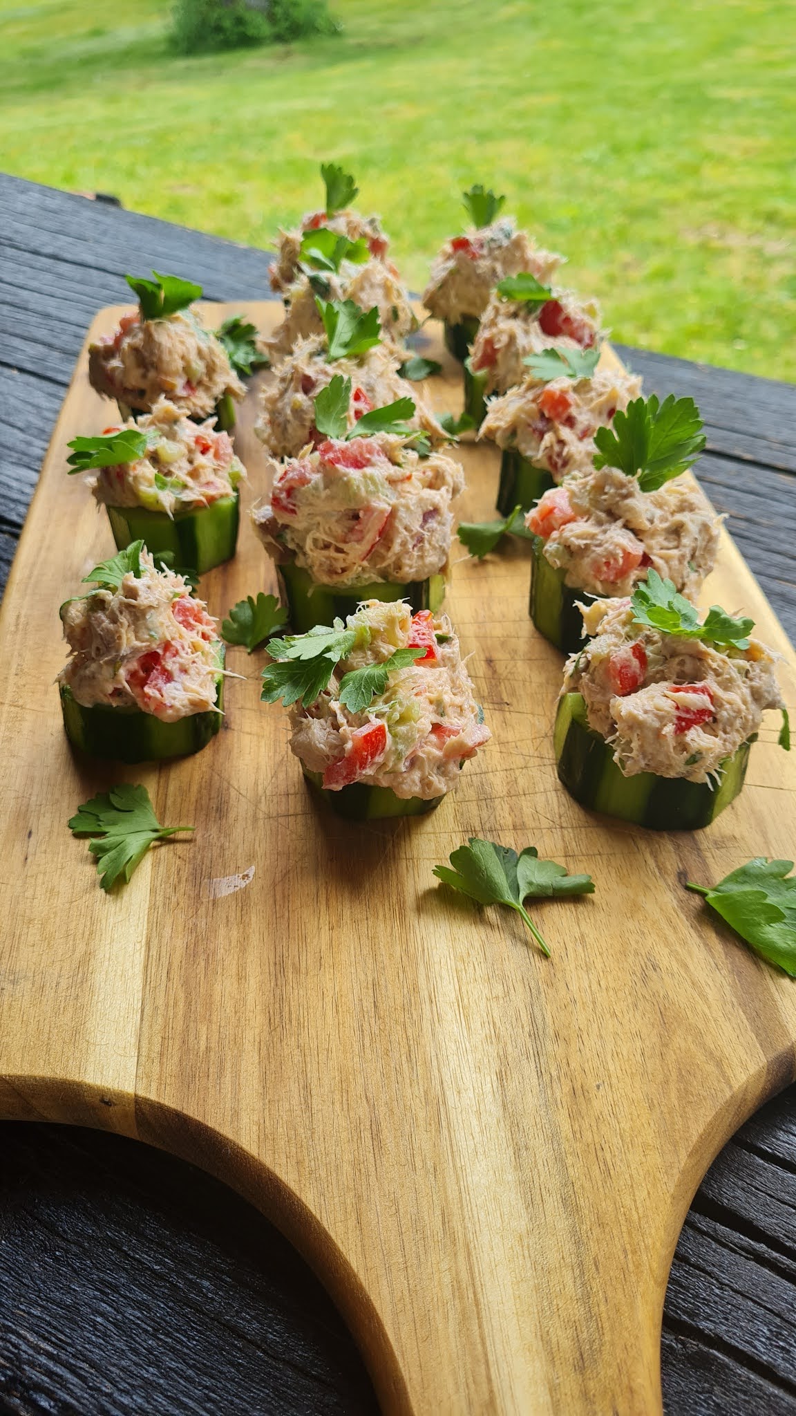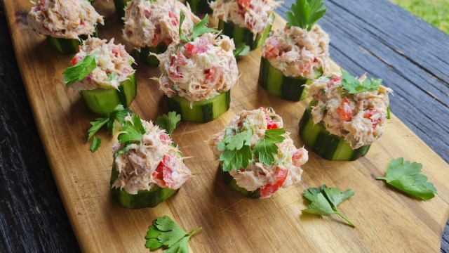 - На дъска подредих филийките краставица и върху всяка от тях сипах по 1 с. л. от разядката.