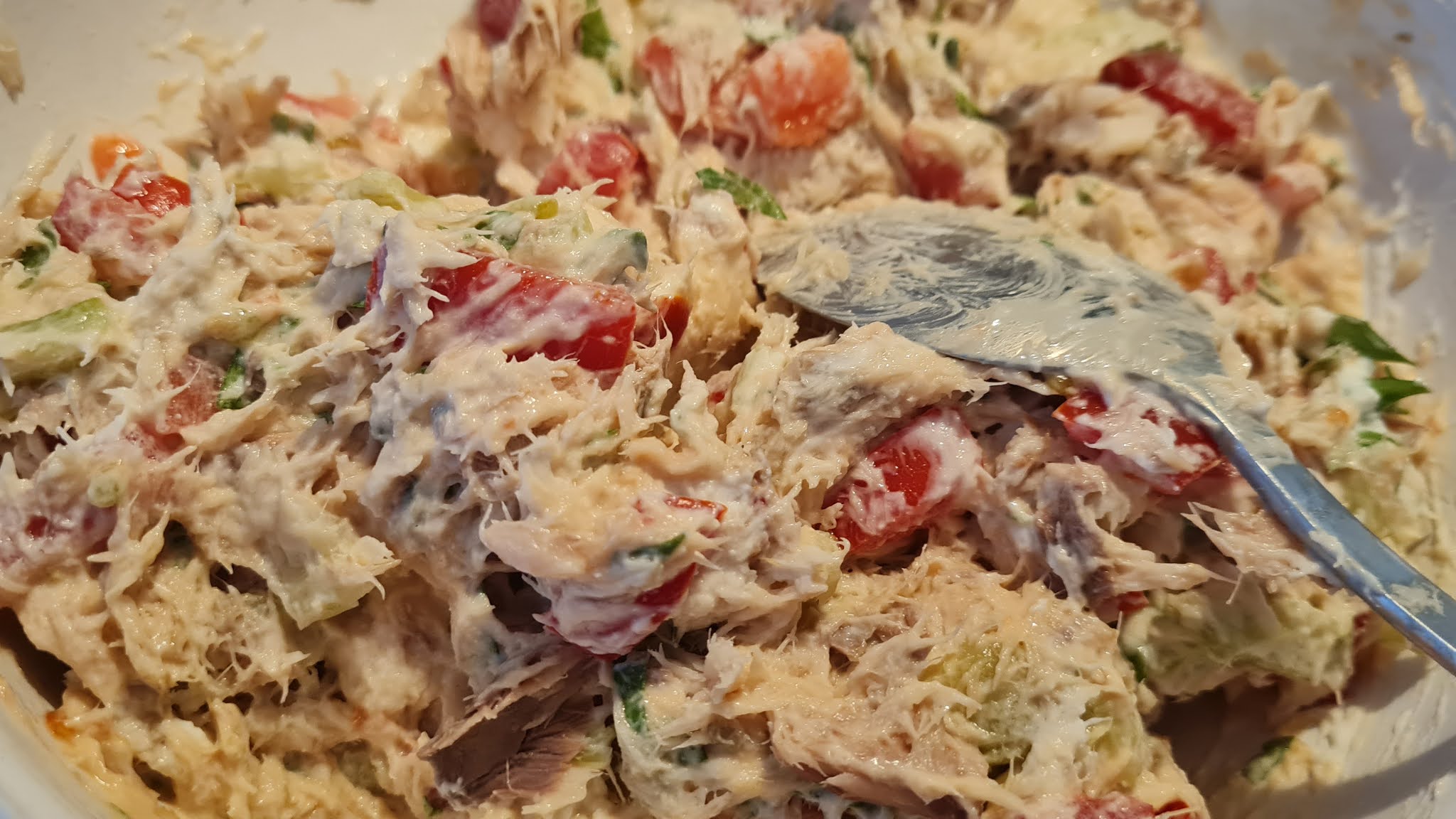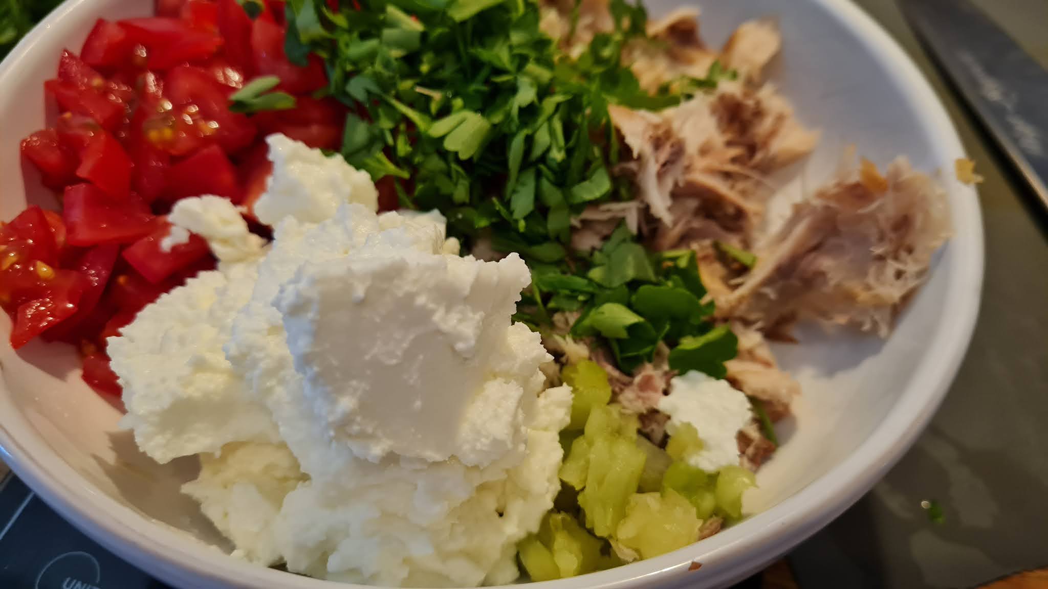 - В купа смесих надробената риба, нарязаното на ситно селъри, нарязаните на кубчета домати, нарязания на ситно магданоз и крем фреш (Quark)