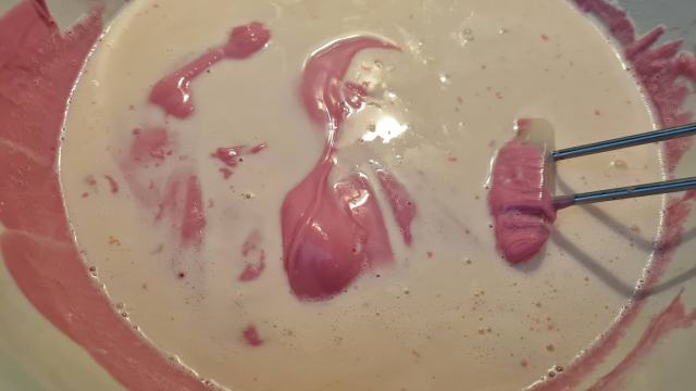 - Намалявам мощността и добавям малко по малко поливаната от ягодовия ганаш.