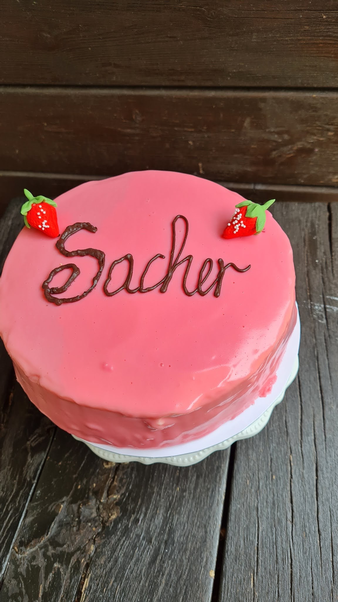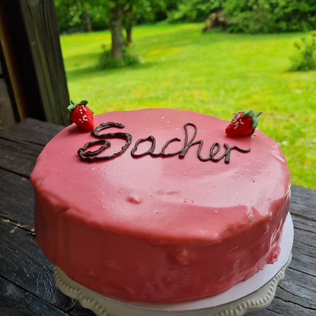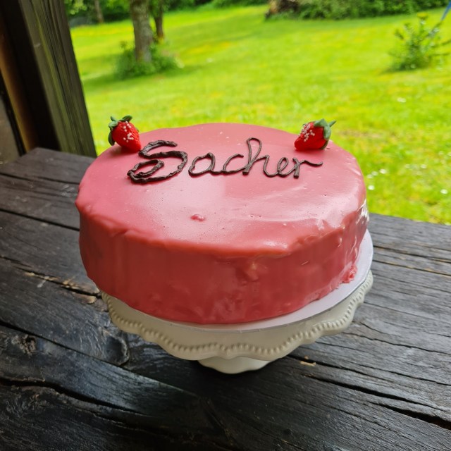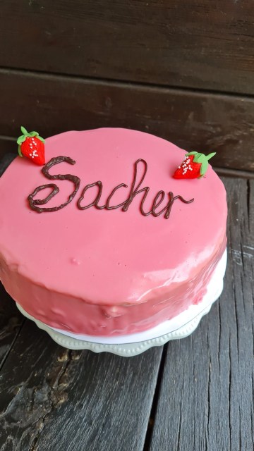 При много мои голи торти използвам предимно блат Сахер и съединявам с чийзкрем (крема сирене и шоколадов ганаш). Така направих и с ягодовия сахер. Заместих ягодовия конфитюр с ягодов чийзкрем. Ароматен и вкусен.