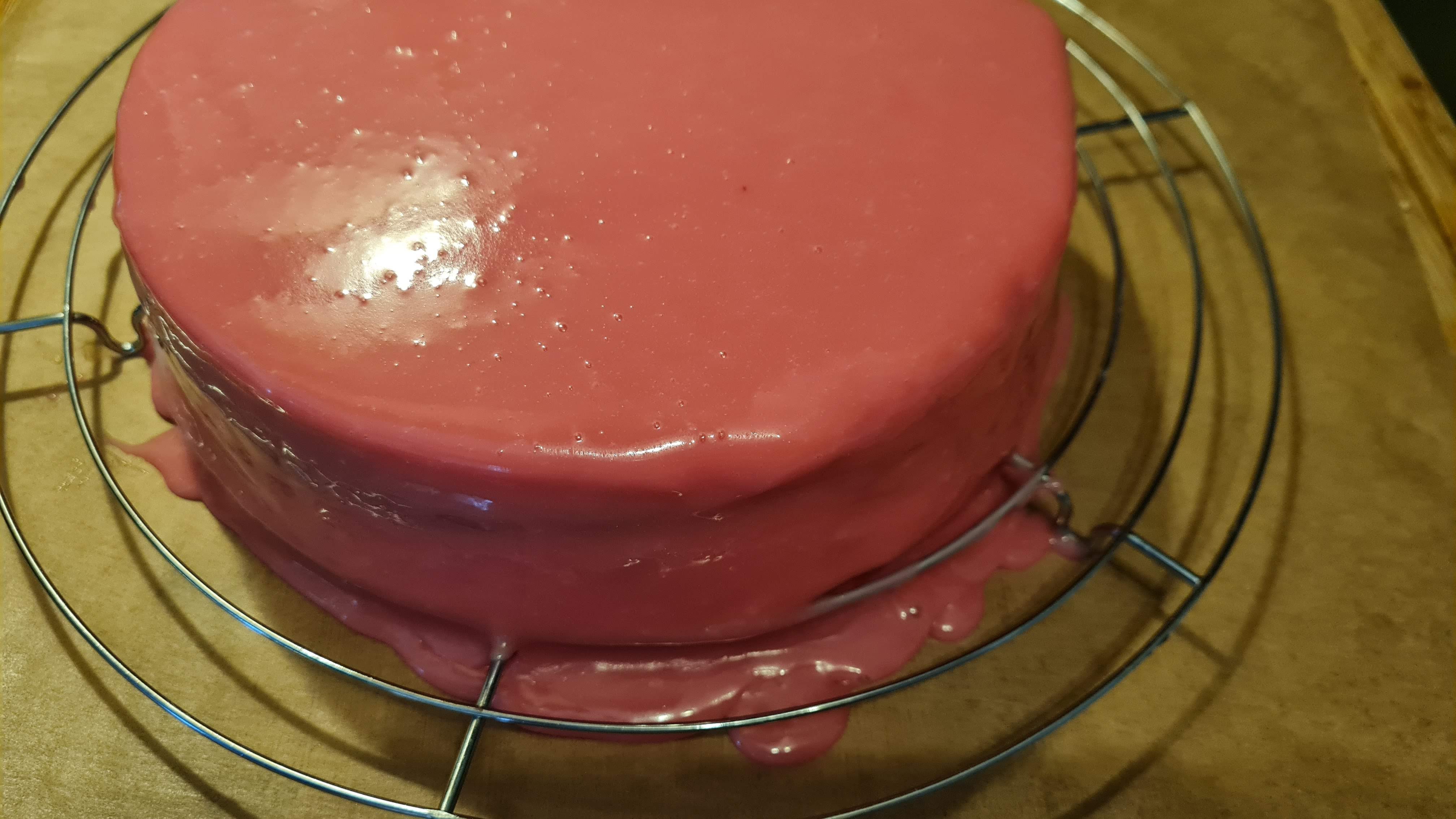 - Охлаждам тортата добре и заливам с останалия ягодов ганаш, който предварително разтопих на водна баня.