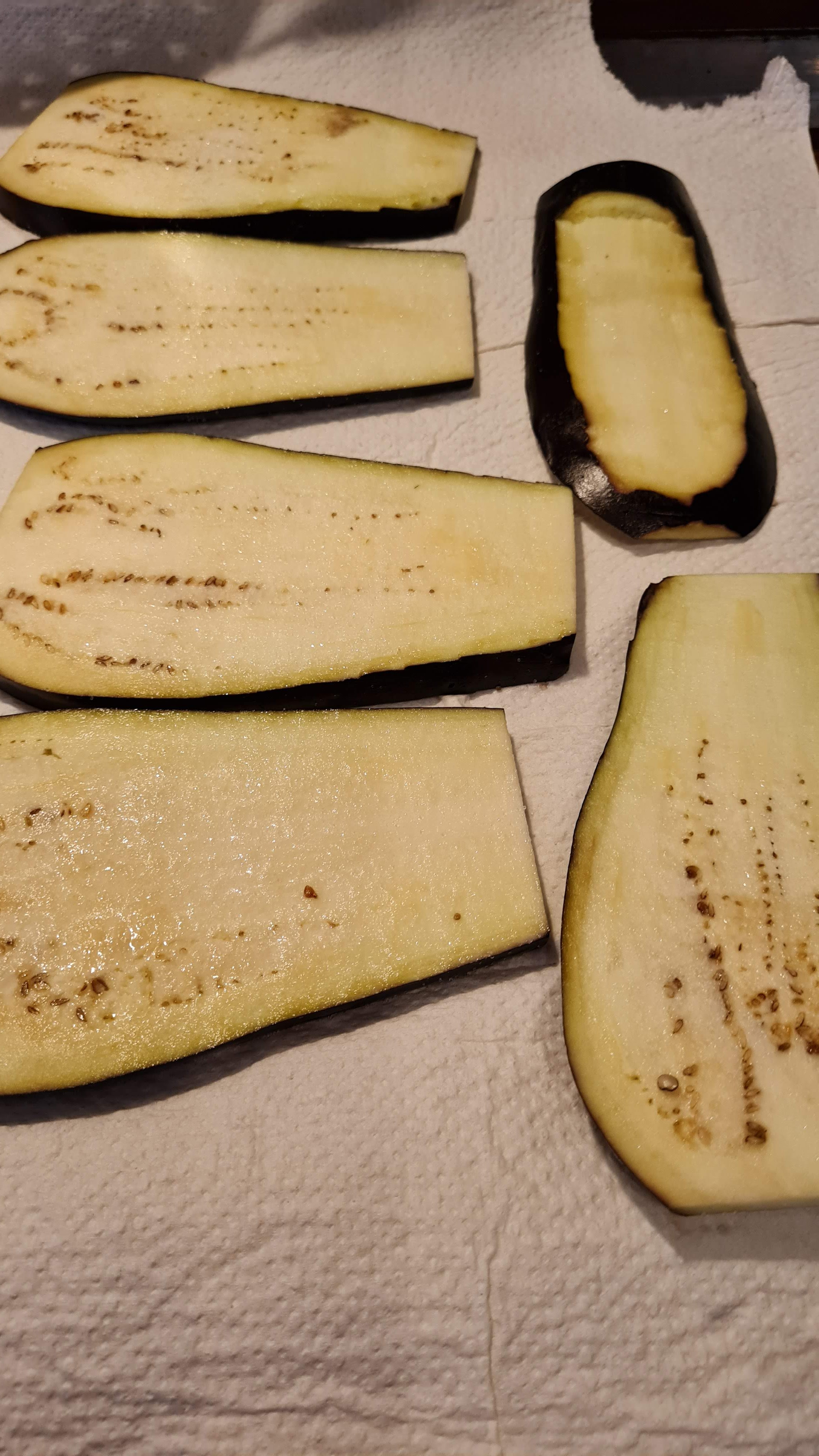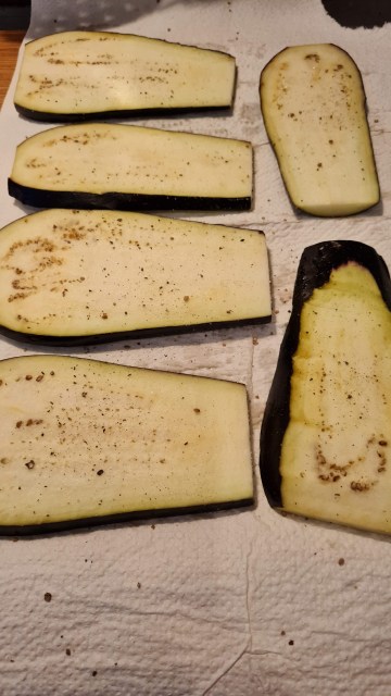 - Оставям за около 10 минути или докато патладжанът си пусне горчивината. Образувалите се капки попивам с домакинска хартия.