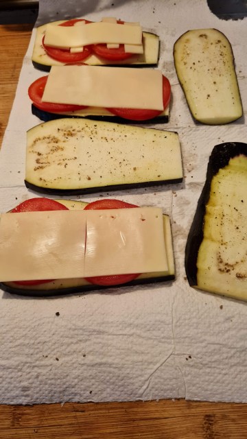 - Върху половината от филийките патладжан подреждам доматите, а отгоре ементал.