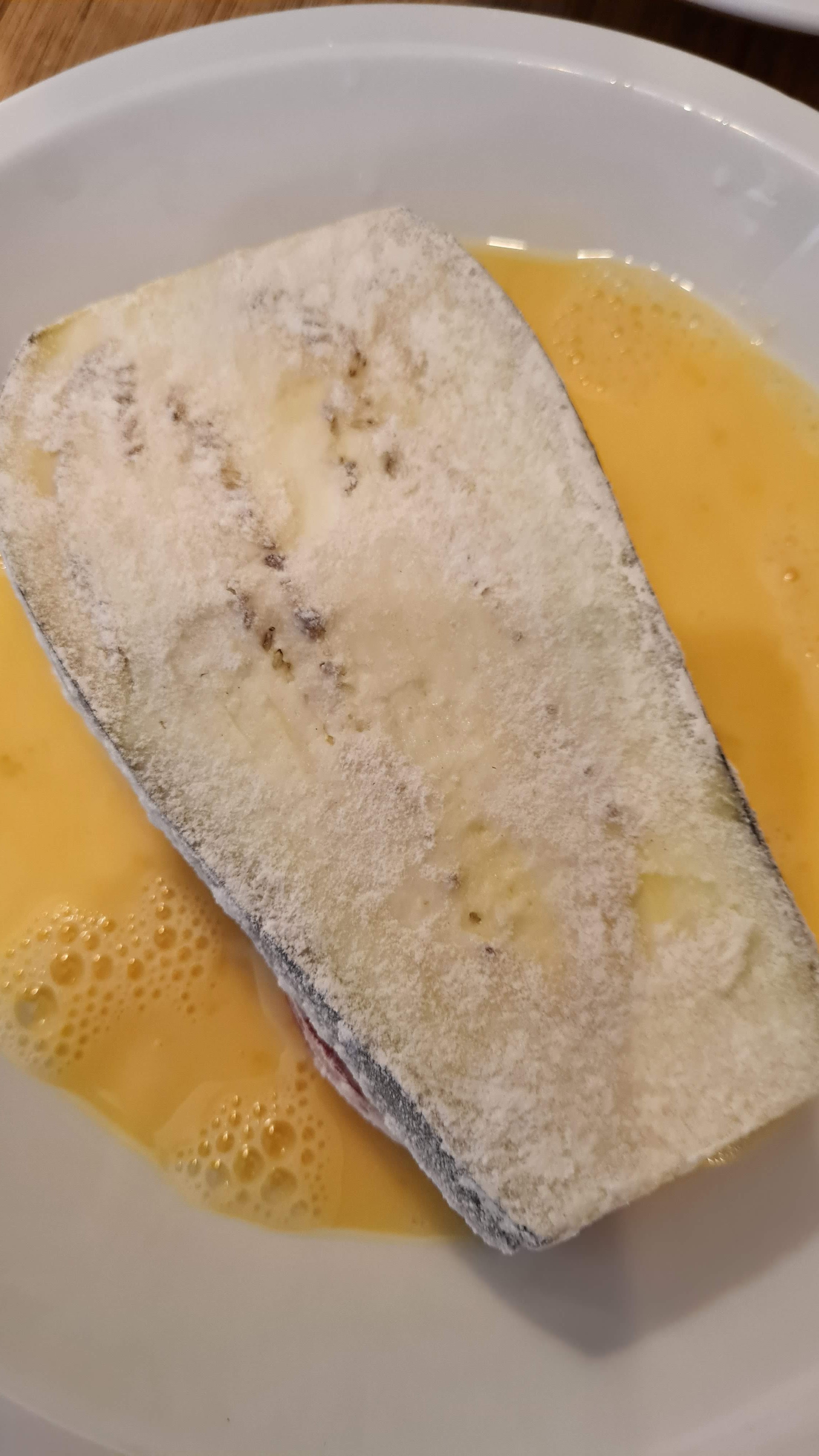 - После потапям от двете страни в разбитите с прясно мляко яйца. Аз успявам и без клечки за зъби да го направя, но Вие за всеки случай фиксирайте с клечки за зъби, за да не Ви се разместват слоевете.