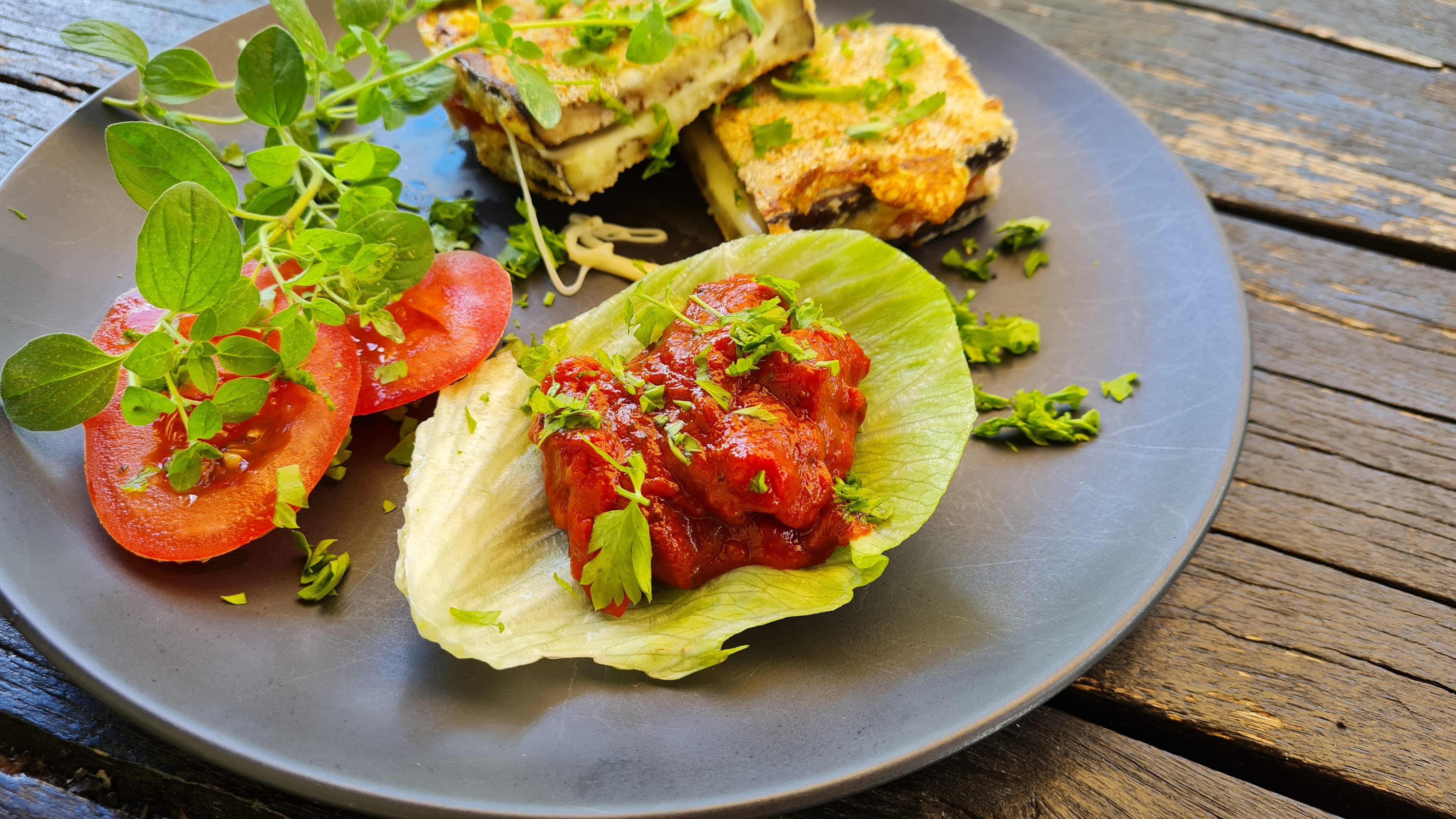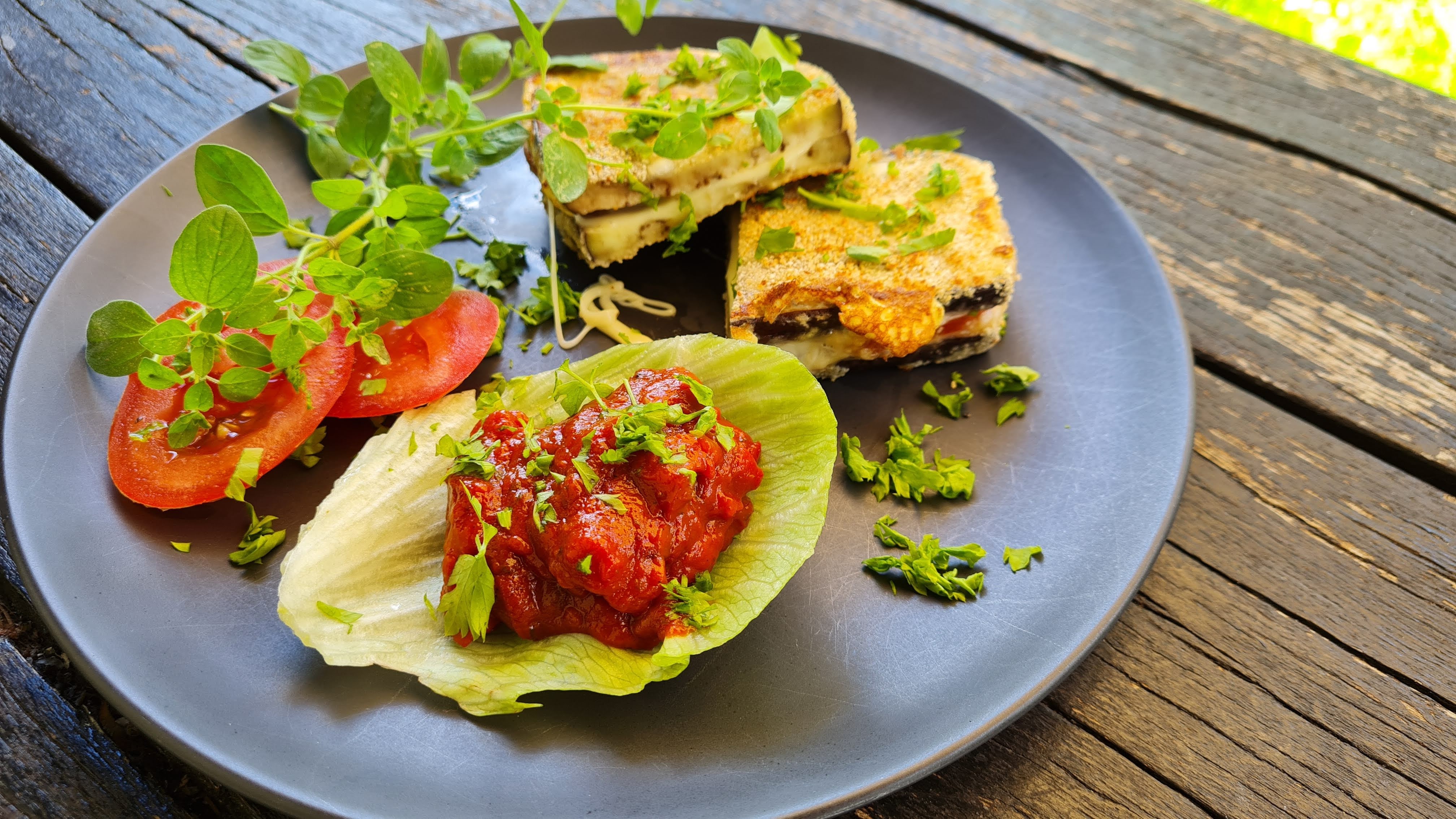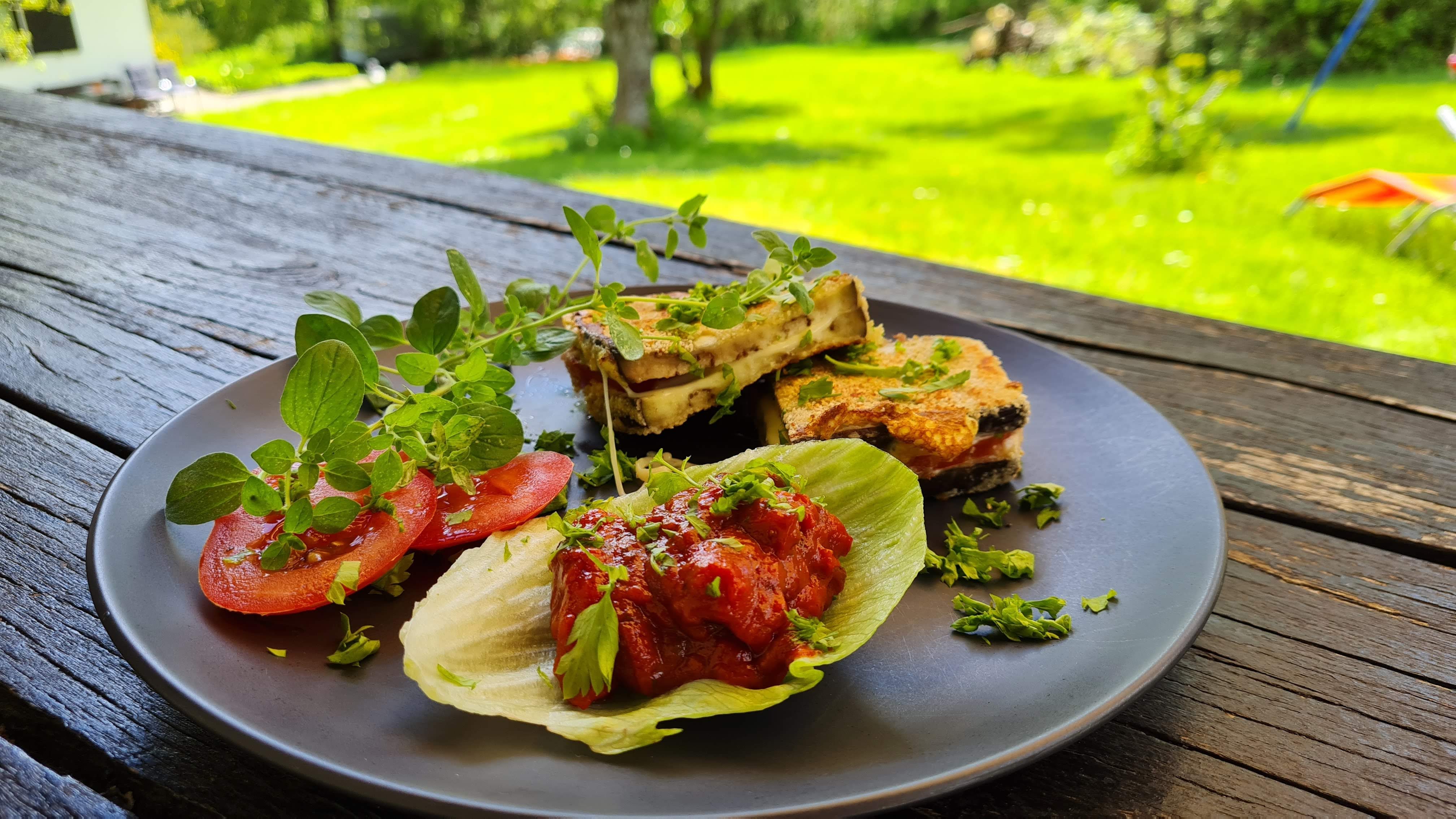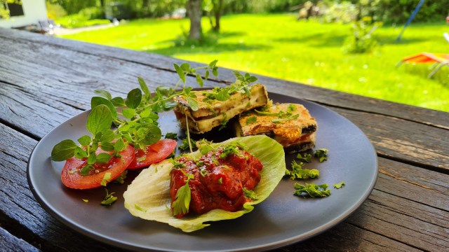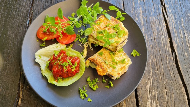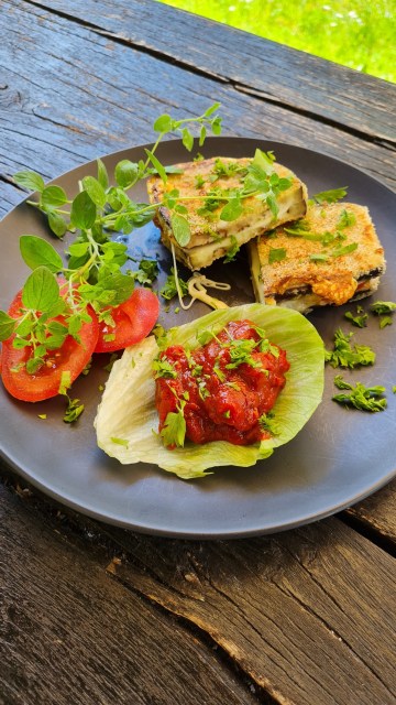 Сервирам шницелите от патладжан разполовени с остър нож и с малко лютеница за гарнитура.