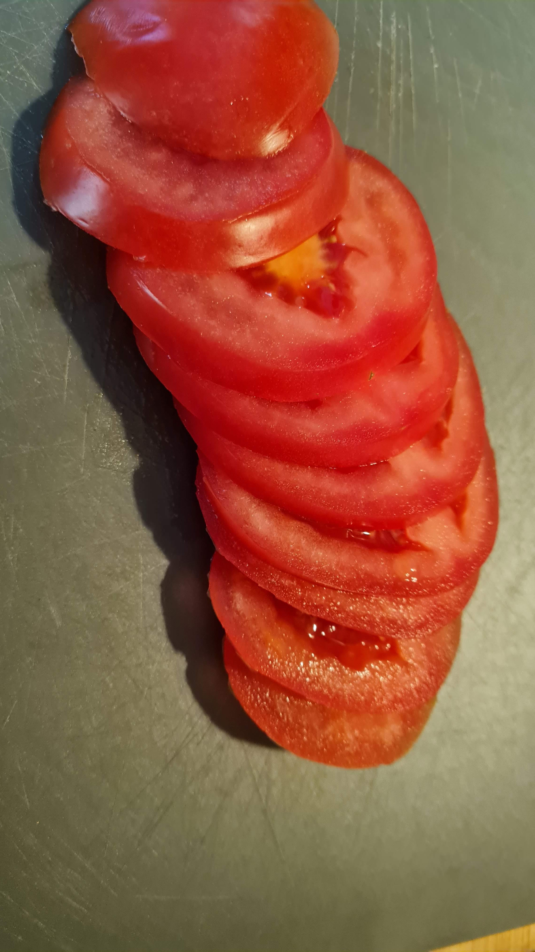 - Доматите също нарязвам на филийки с дебелина 5 мм.