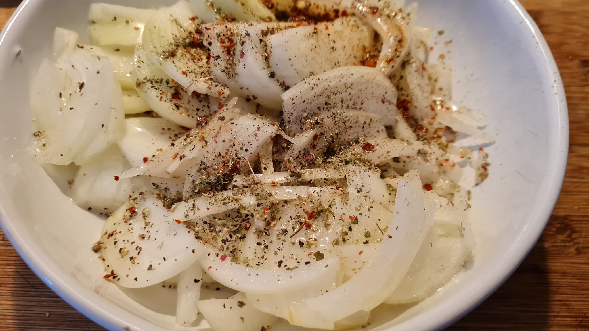 - Нарязвам лука на ленти, които изсипвам в купа. Овкусих със сол, пипер и майоран. Заливам с около 50 мл олио и оставям за около 15 минути да се смесят вкусовете.