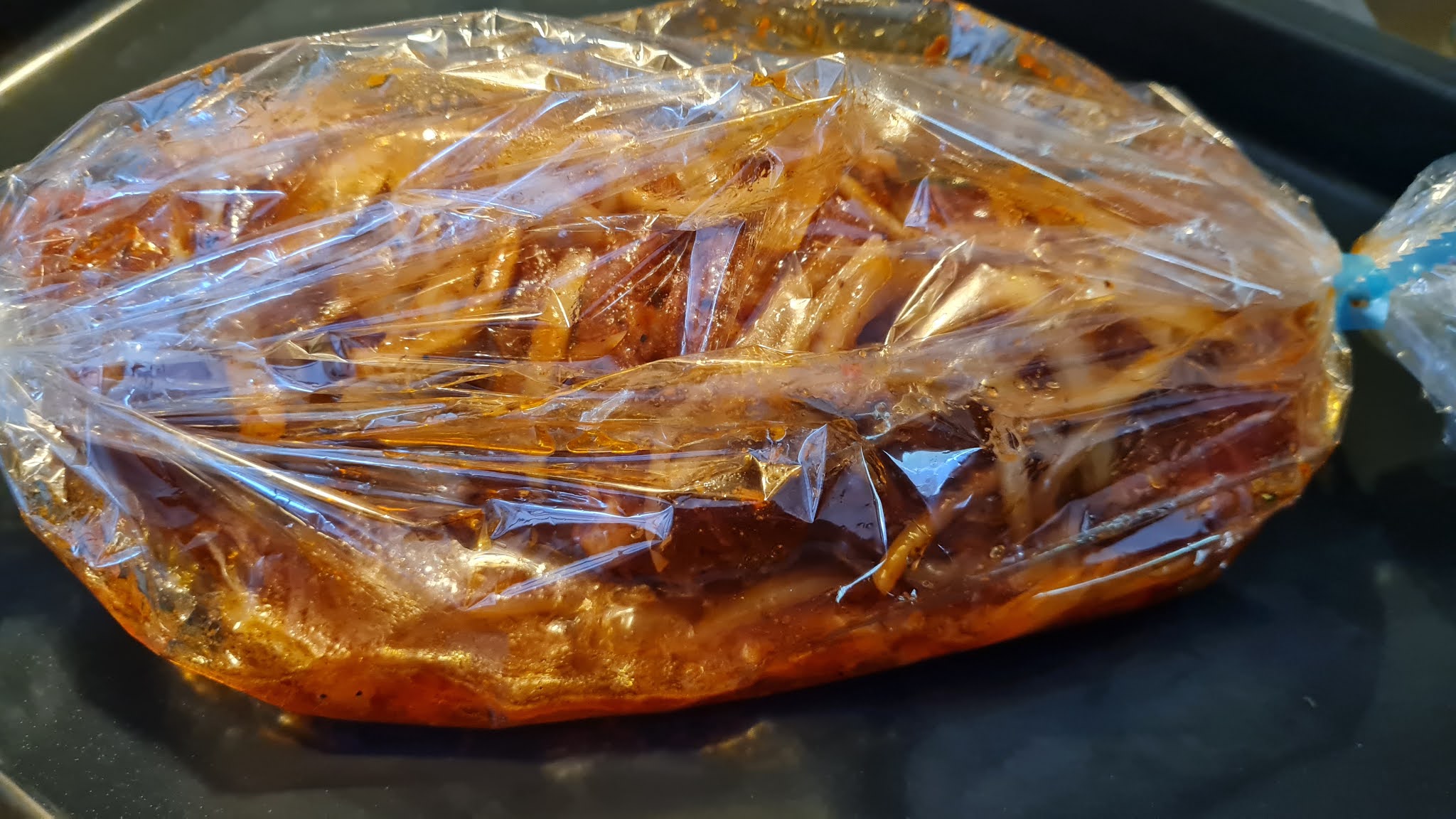 - Слагам маринованото руло в плик за печене, като добавям лука, маринатата и 100 мл бира.