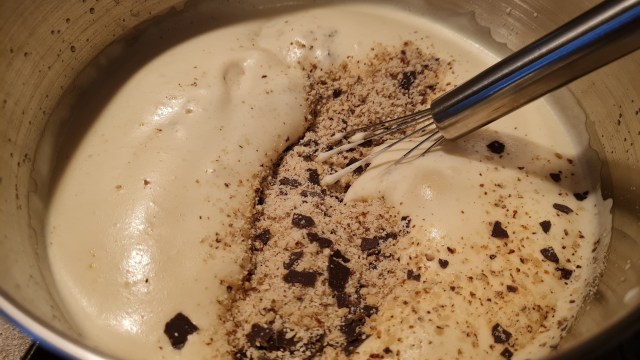 - Добавям сухата смес към пухкавата яйчена смес на два три пъти и бъркам само с тел за разбиване.