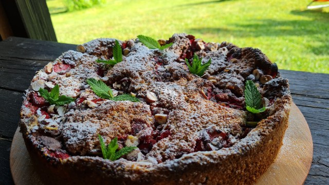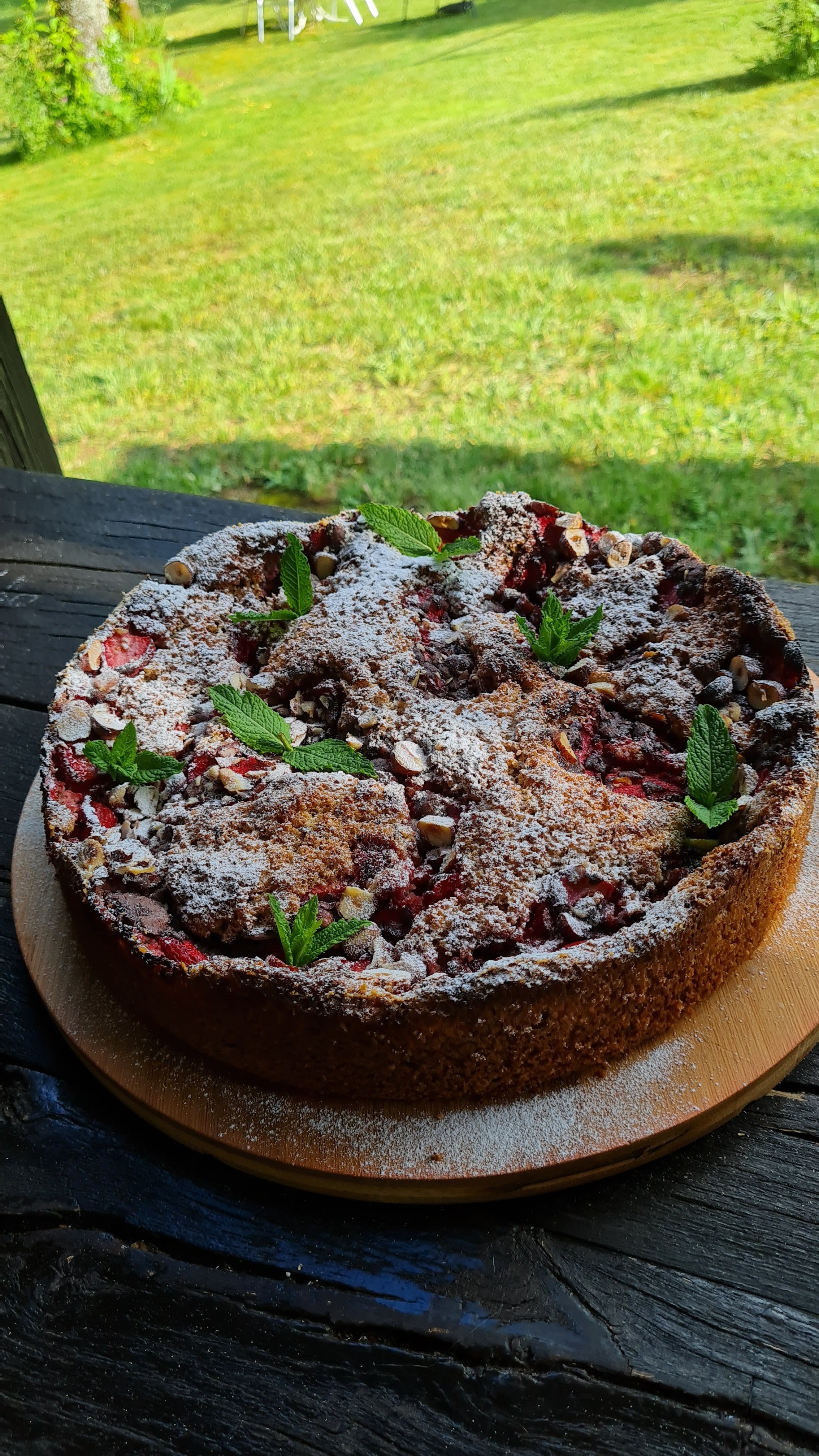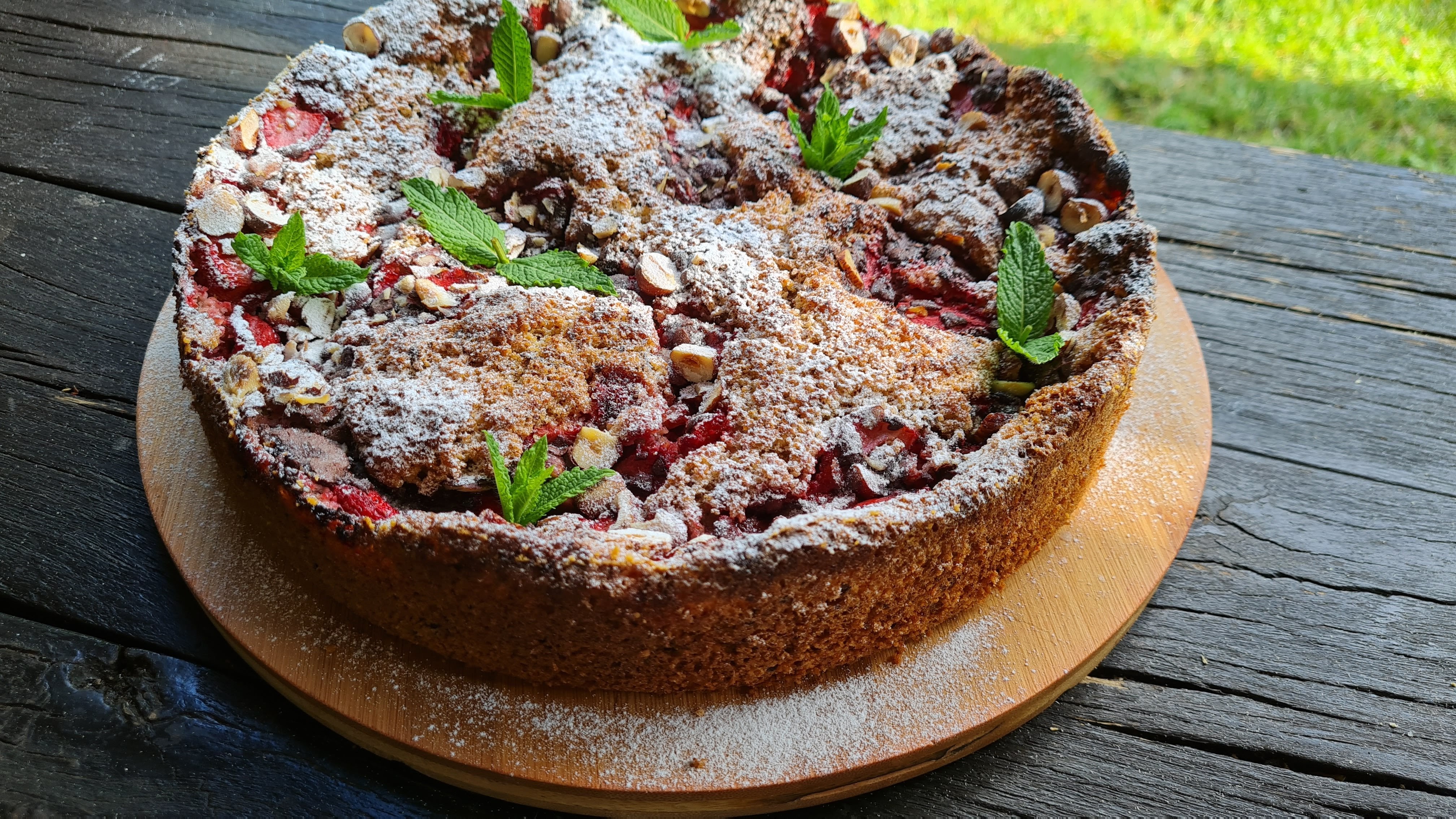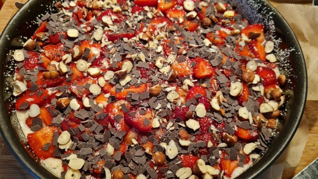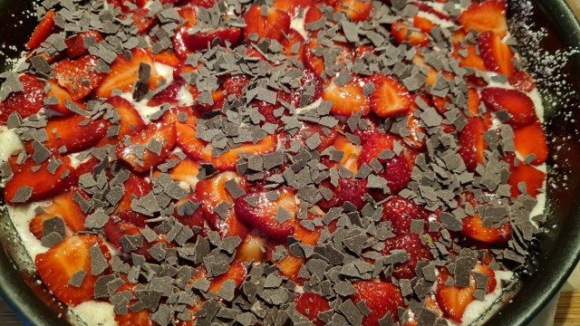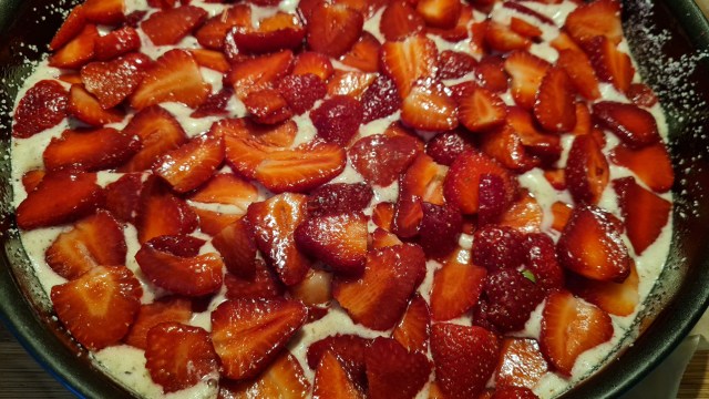 На немски се нарича потънал сладкиш, защото от тежестта на ягодите потъва.