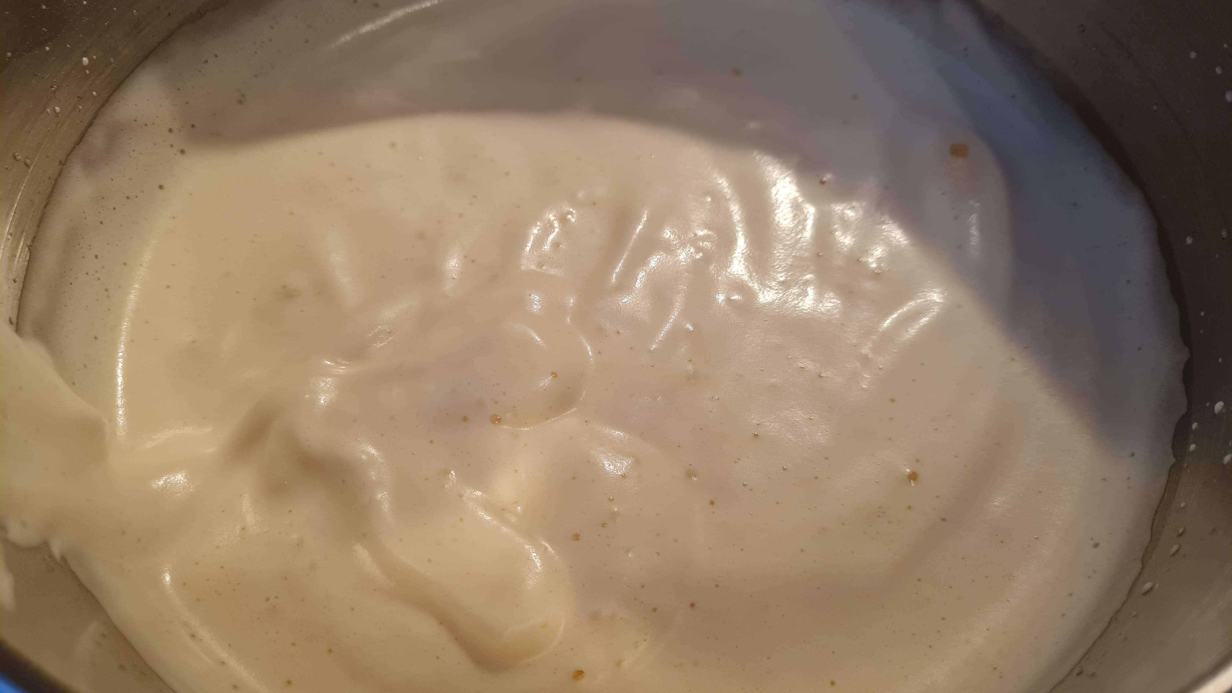 - Разбивам яйцата със захарта и ваиловата захар за около 5 – 7 минути до пухкава и почти бяла смес.
