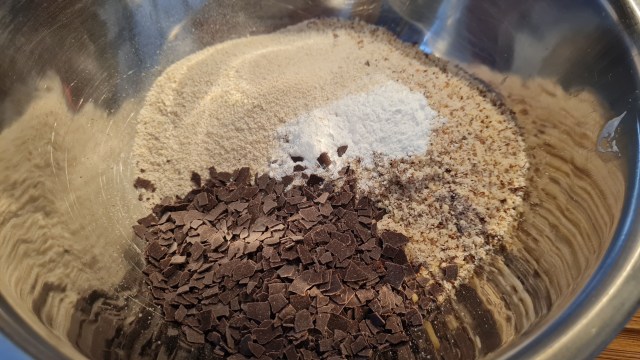- В купа смесвам смлените лешници, галетата, бакпулвера и 50 г от шоколадовите люспи.
