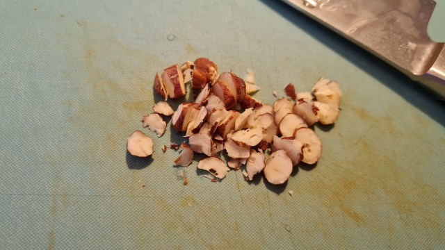 - Нарязвам лешниците на тънки филийки. Има в магазина и готово нарязани, ама както знаете аз реших да направя този сладкиш в последния момент и нямах налични.