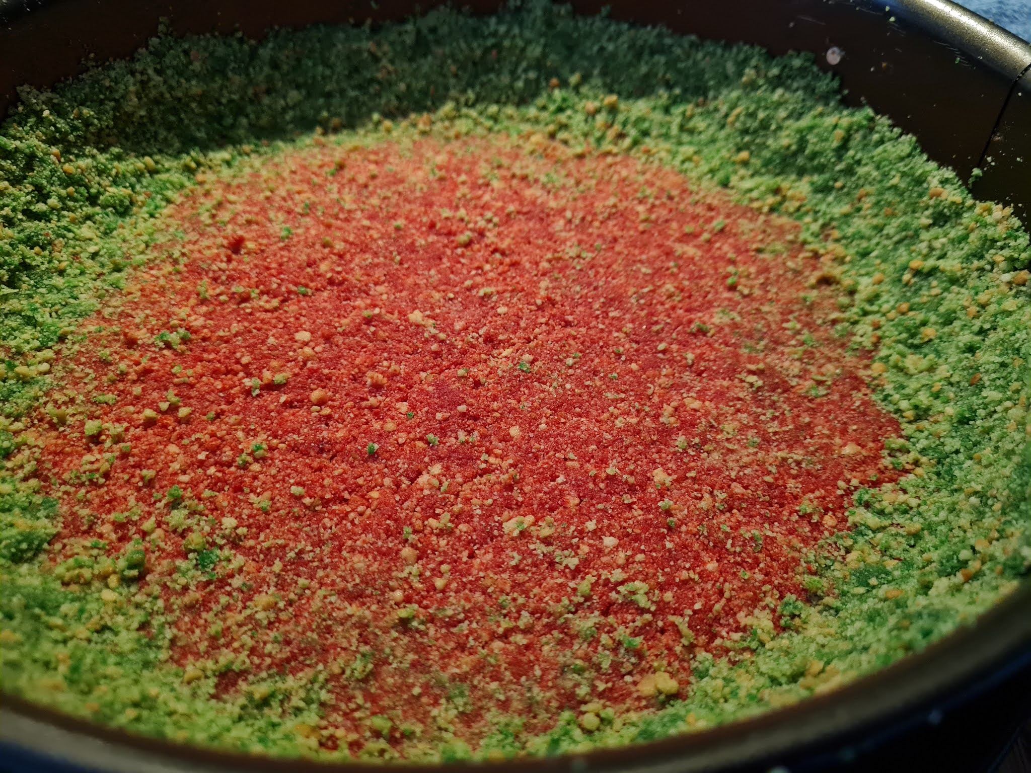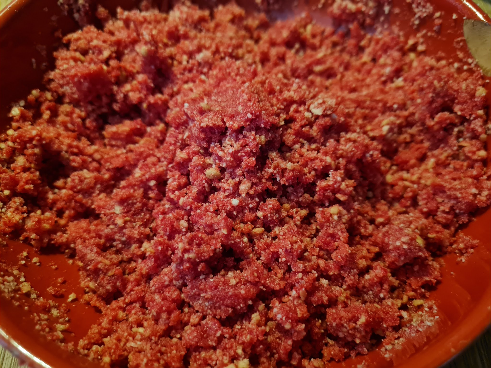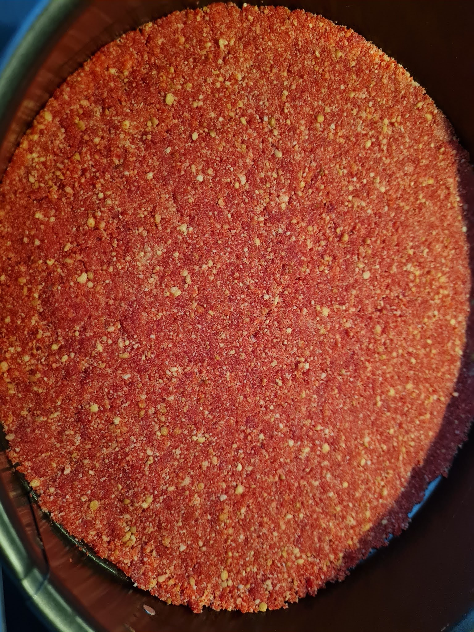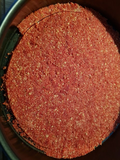 - На дъното на формата с падащи стени изсипвам червеното масло и притискам така, че да се получи плътен и равен блат.
