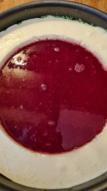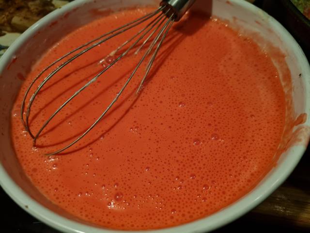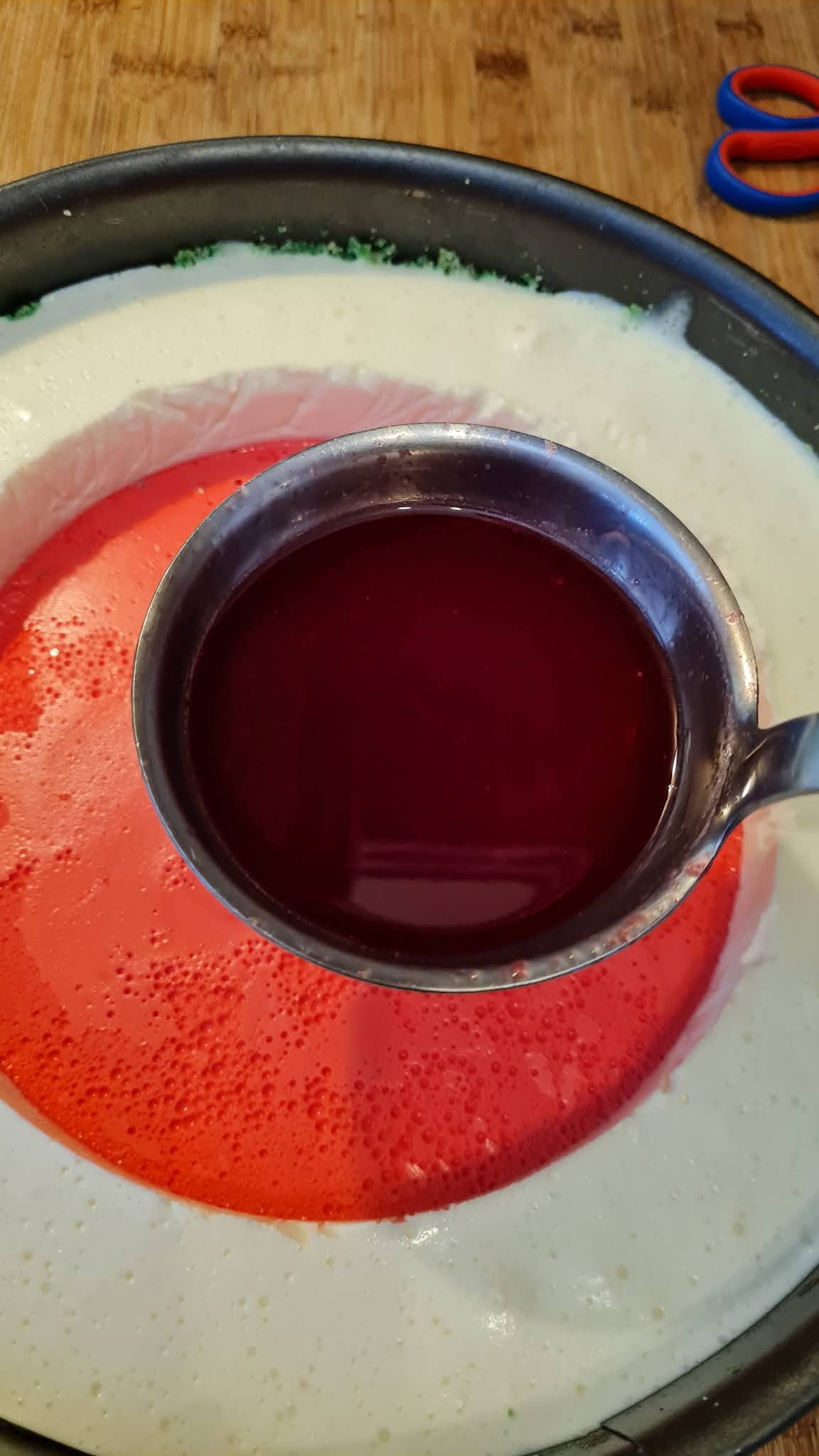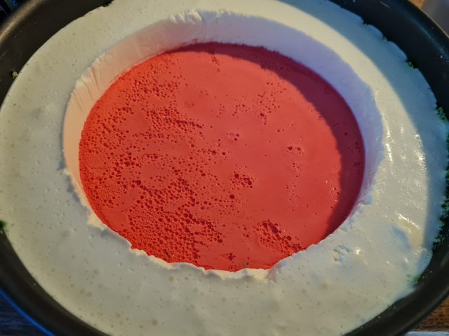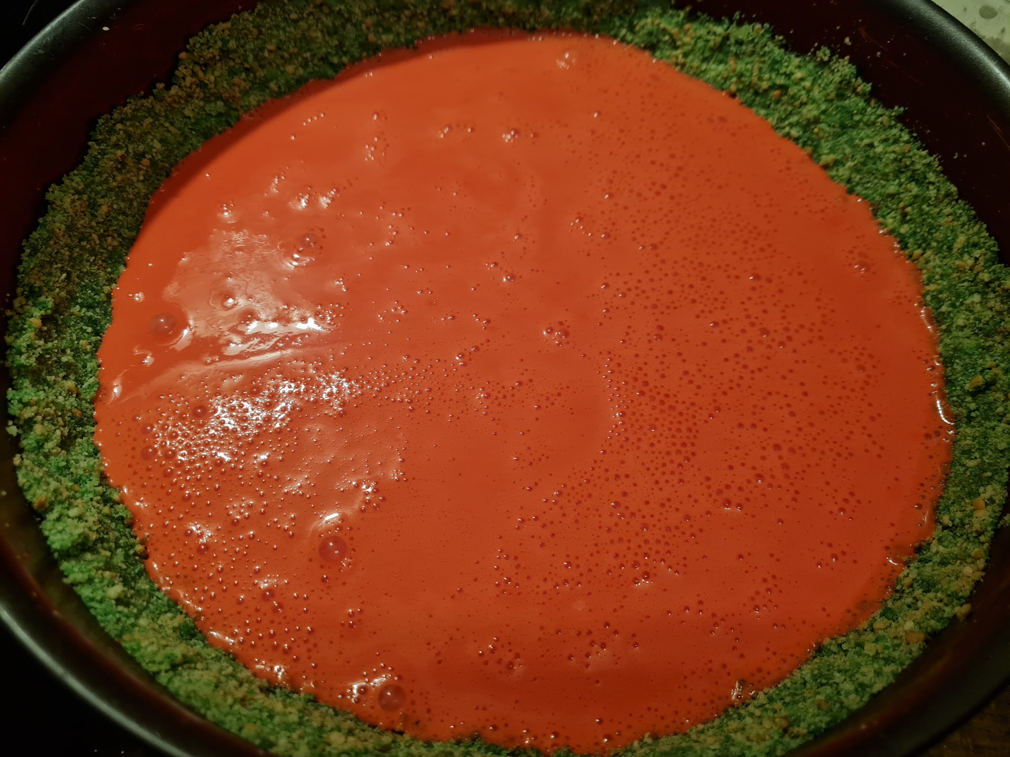 - Червения крем изсипвам върху охладения блат и прибирам отново за около половин час в хладилник или докато стегне.