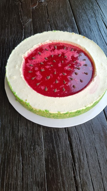 - Върху добре стегналата торта диня подреждам и шоколадовите семки.