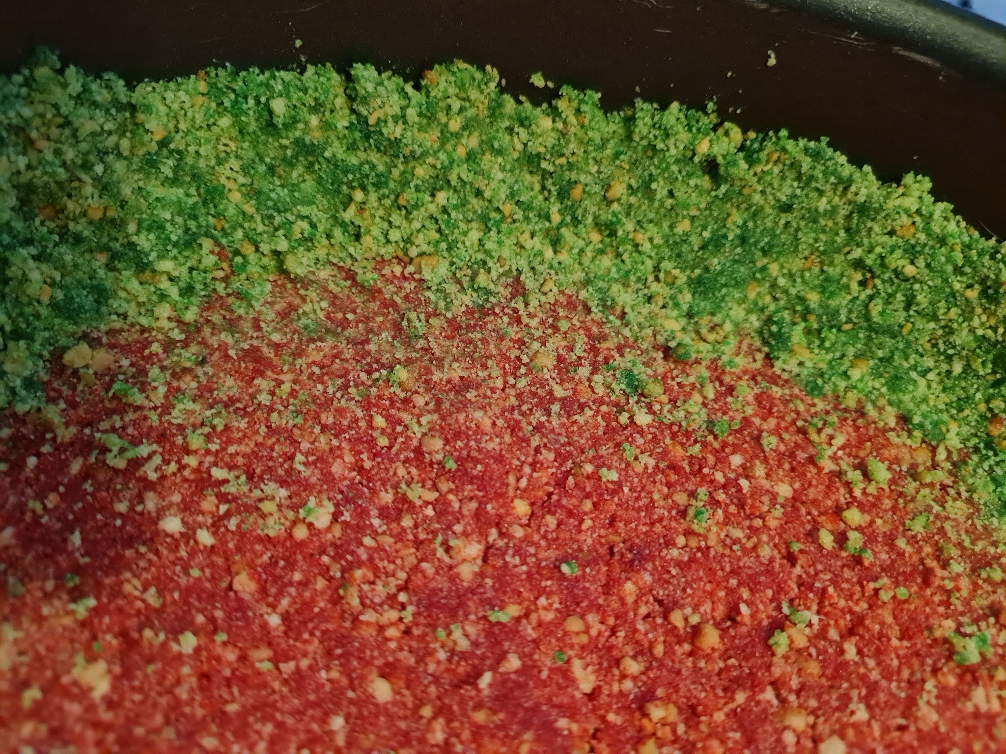 - Половината бисквити смесвам с червеното масло, а другата половина – със зеленото масло.
