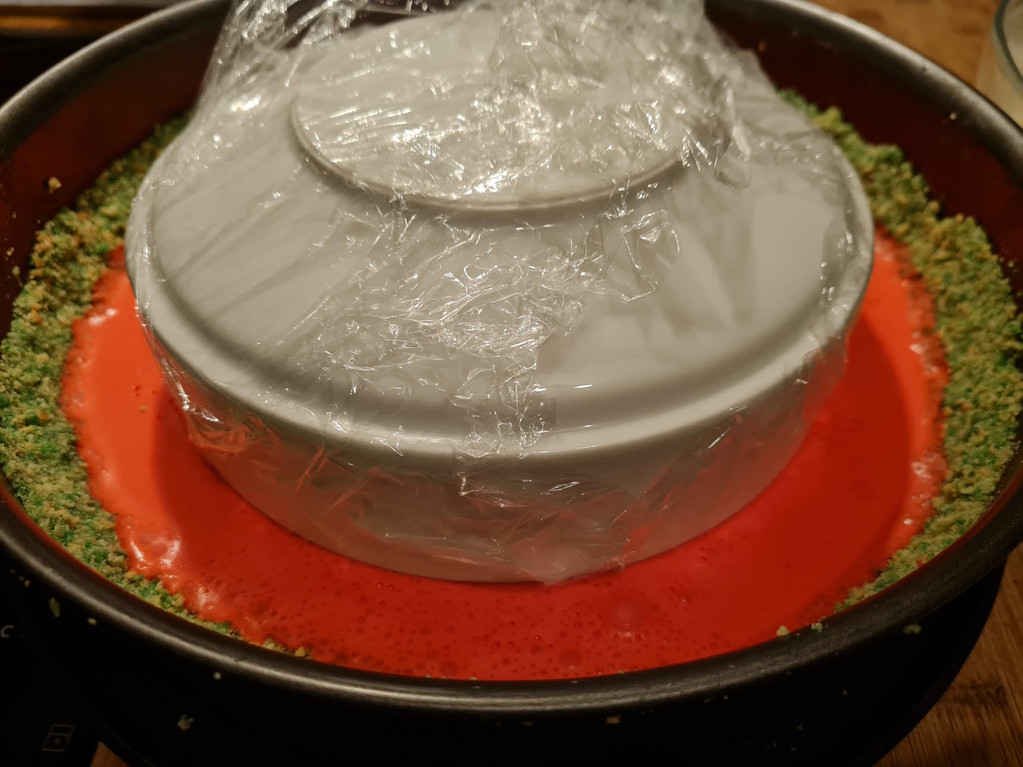 - Подходящ размер купа увивам в стреч фолио и поставям обърната върху стегналия червен крем. Центрирам.