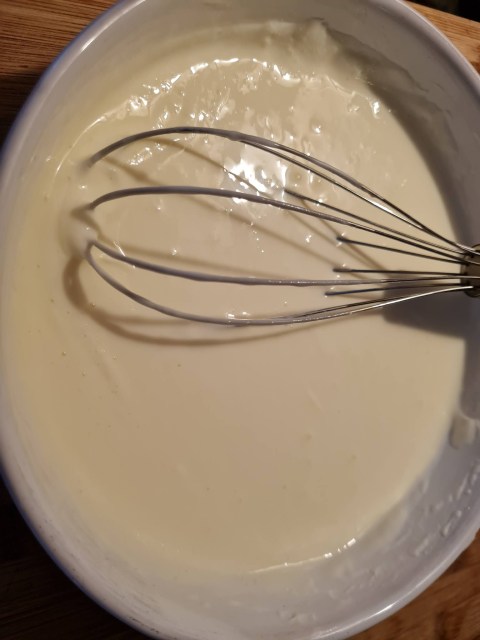 - Добавям желатина към крема сиренето и разделям сместа на две части.