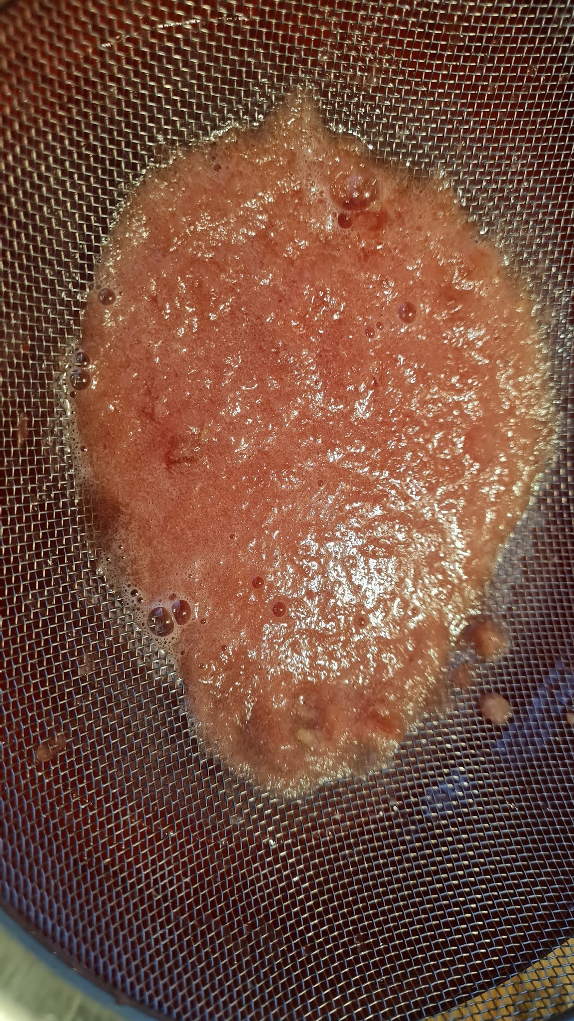 - Минавам пасираната диня през цедка, за да остане само течност.