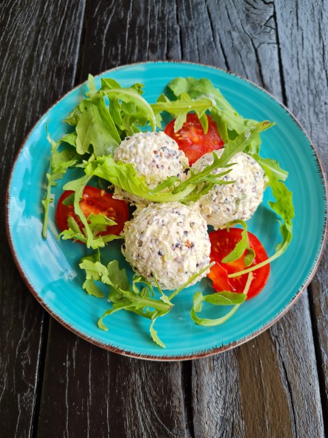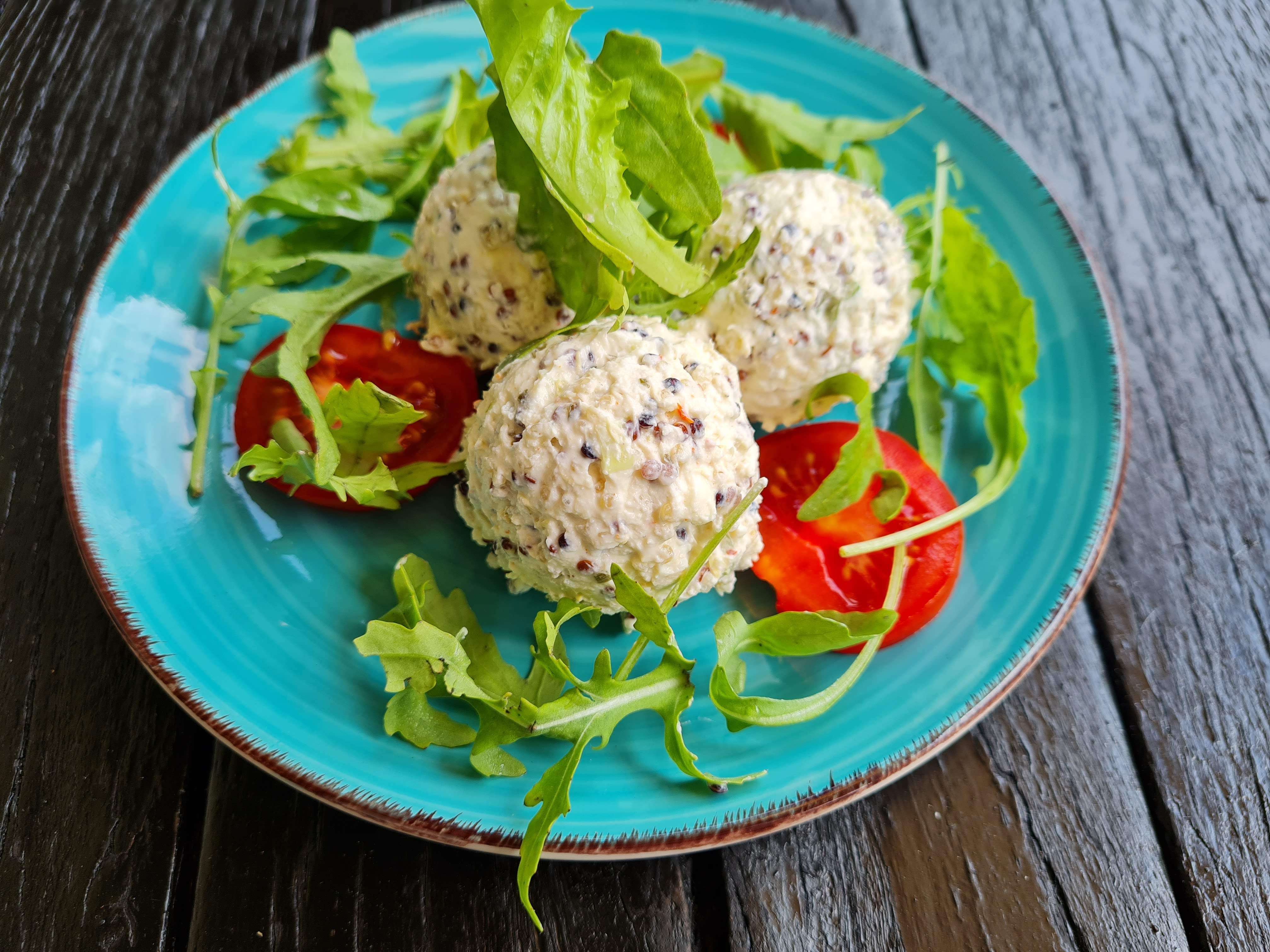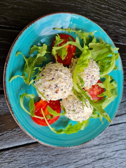 - Сервирам или върху филии български розови домати, или (поради липсата им в Германия) с филийки домати отстрани на топките салата.