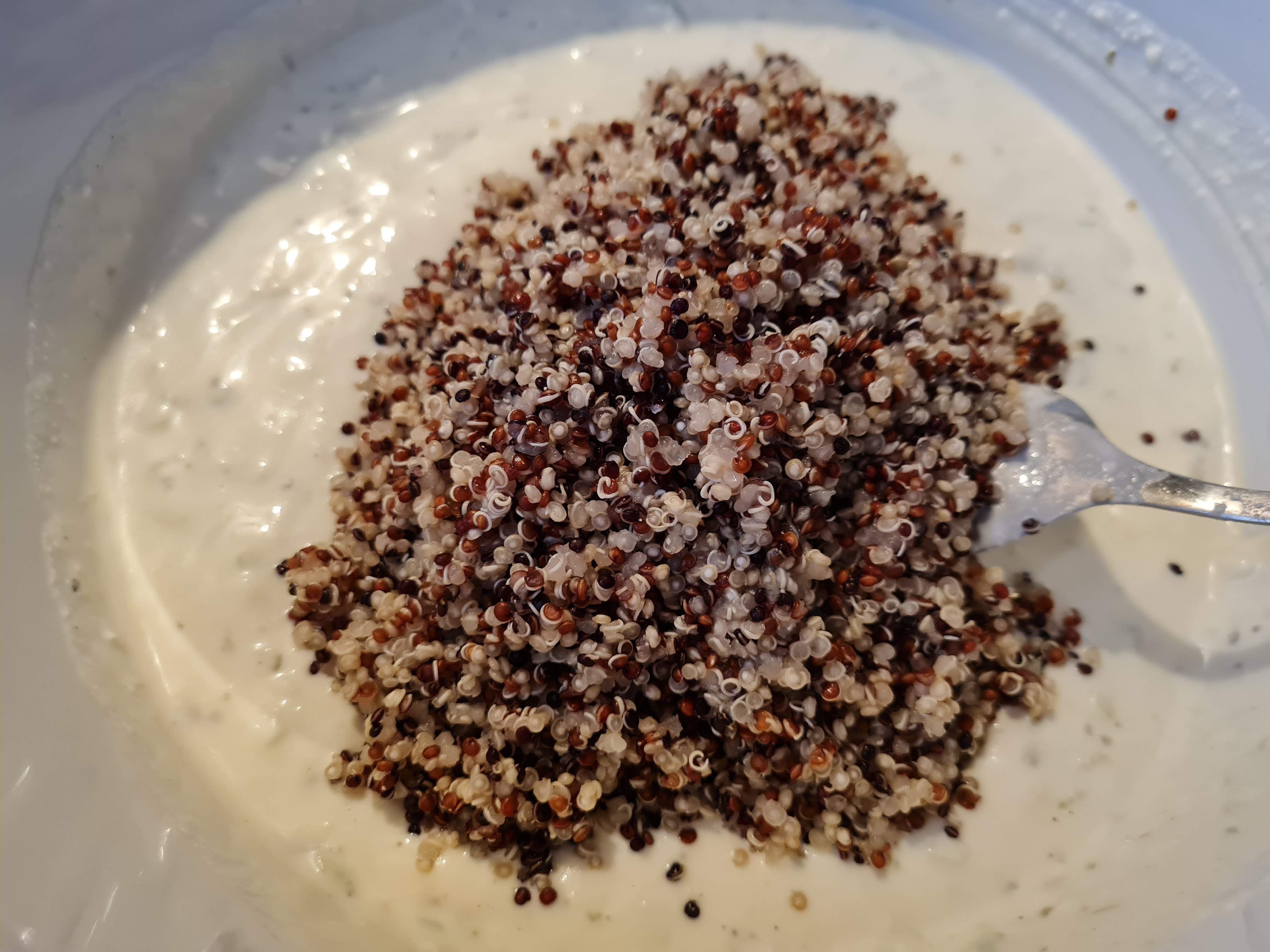 - Добавям охладената киноа към крема сиренето и разбърквам.