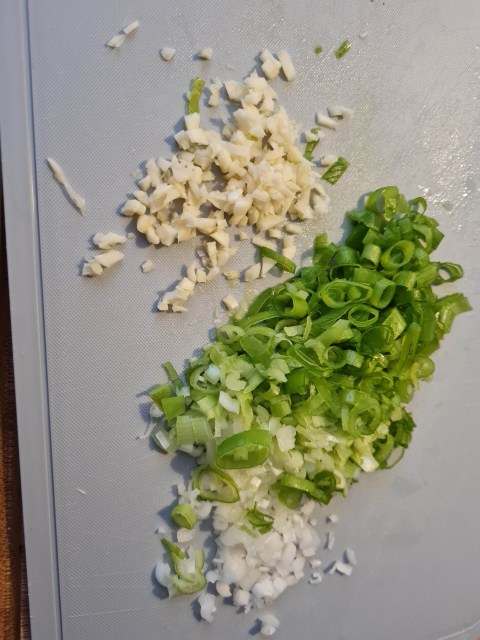 - Нарязвам пресния лук и скилидките чесън на много ситно.