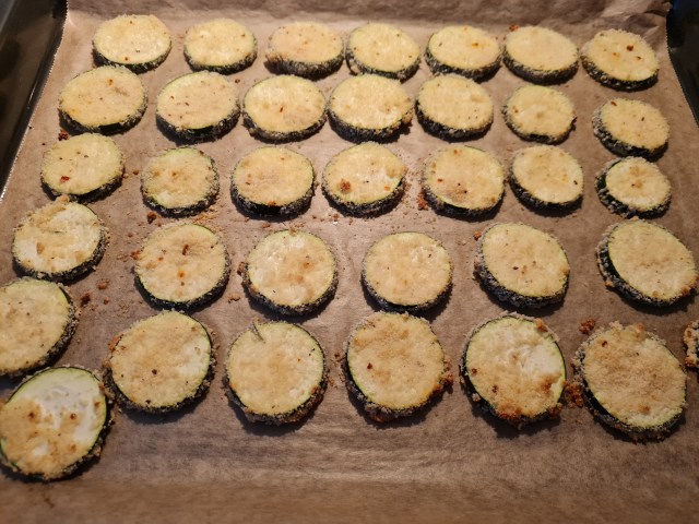 - Нареждам панираните тиквички в тавата, покрита с хартия за печене.