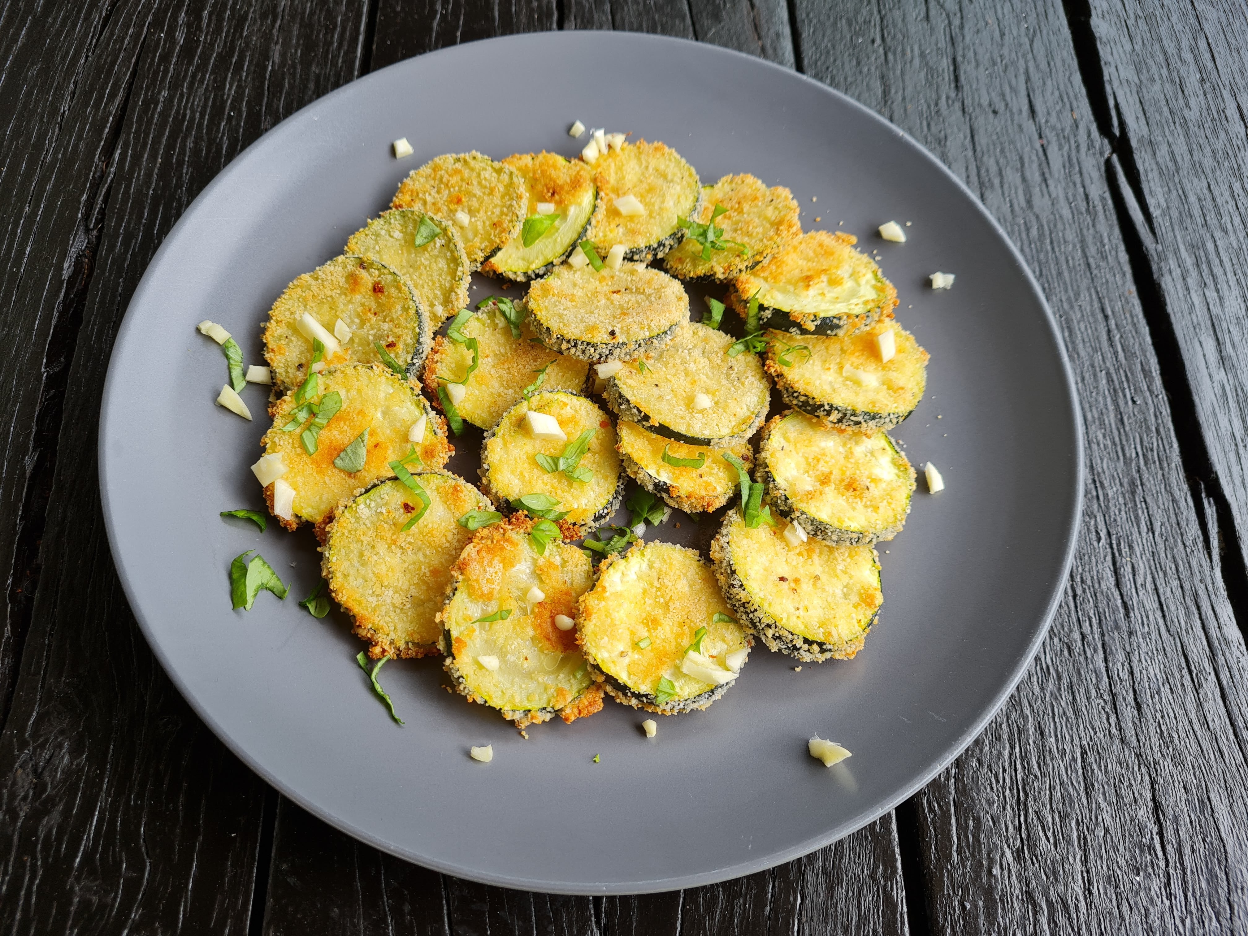 - Всяко кръгче тиквичка потапям първо в яйце, отцеждам и после овалвам в пармезановата смес.