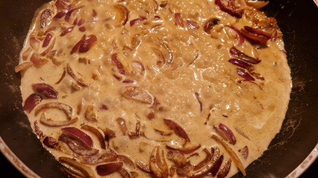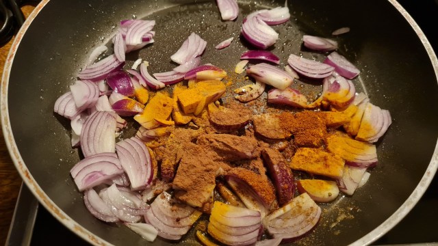- През това време загрявам останалото олио и в него изпържвам за около 2 минути нарязания на лентички червен лук, заедно с куркумата, кимиона, кайна и канелата.