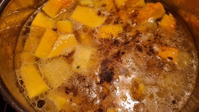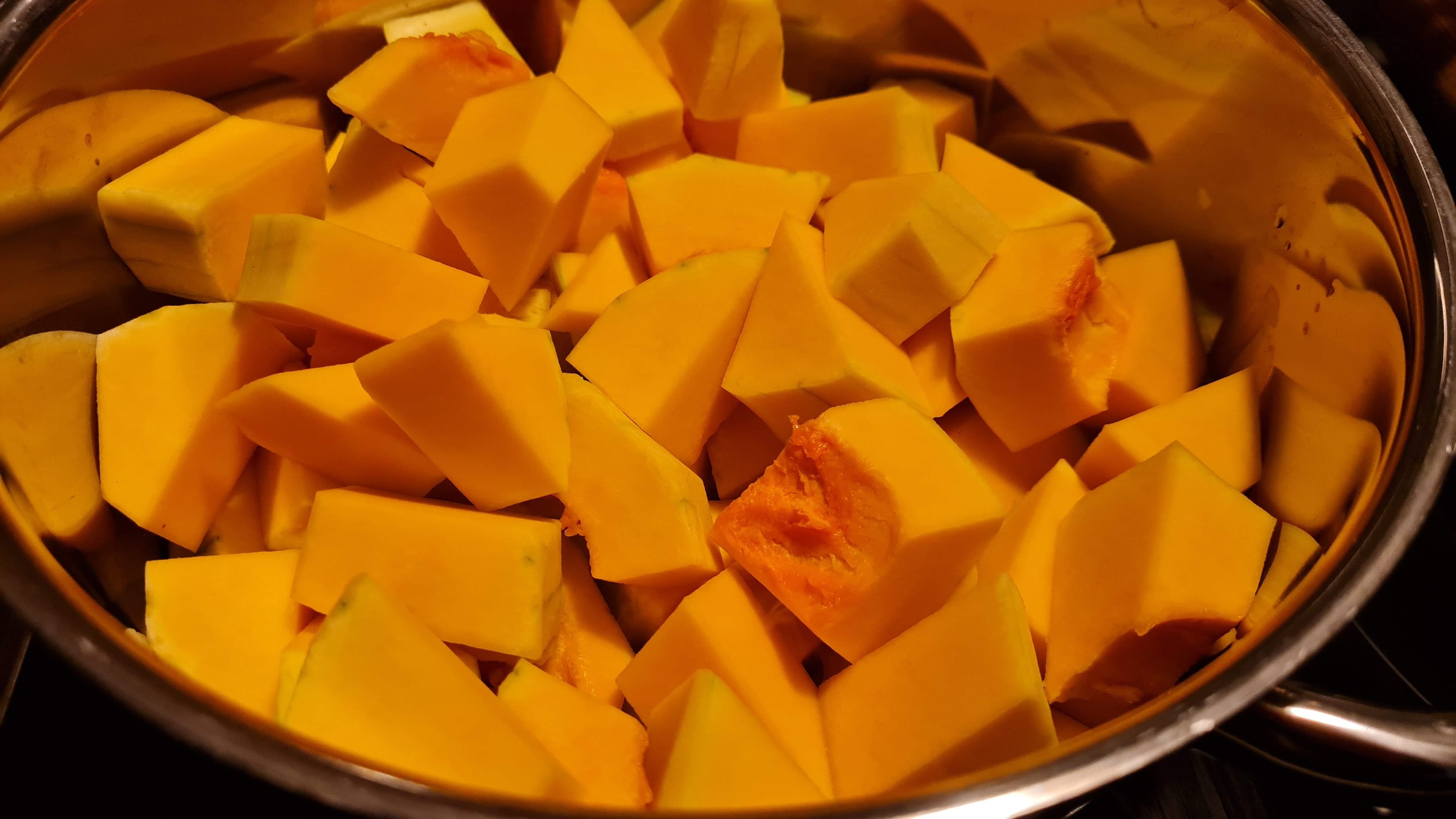 - Загрявам половината мазнина в дълбока тенджера и задуших за кратко тиквата.