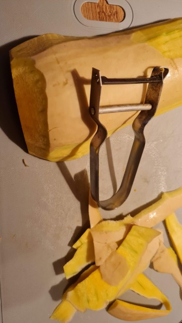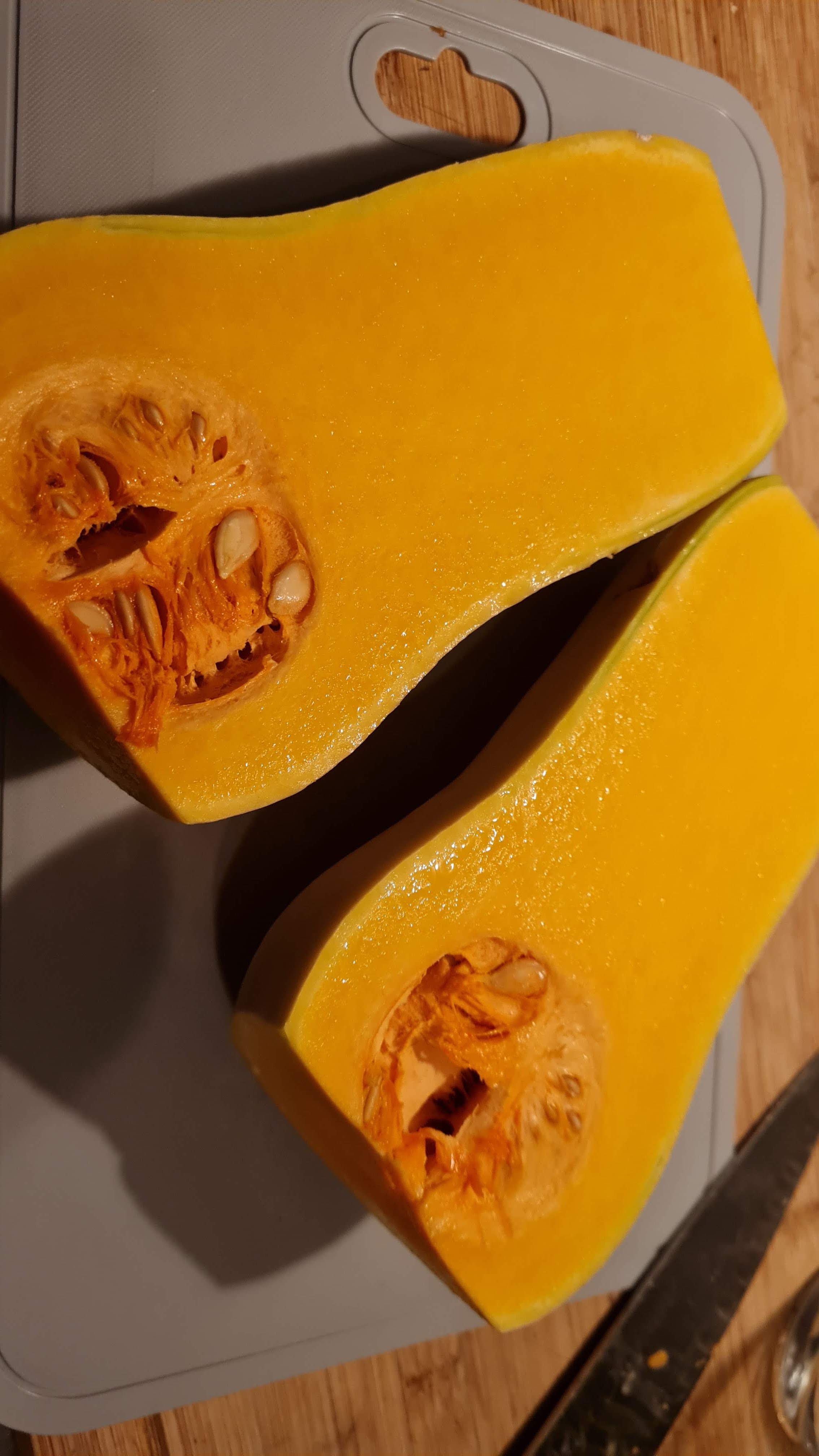 Сортът, който използвам за тази рецепта е Butternuss – Kürbiss, известна в България като мускатова тиква или цигулка. Моята е около 800 г.