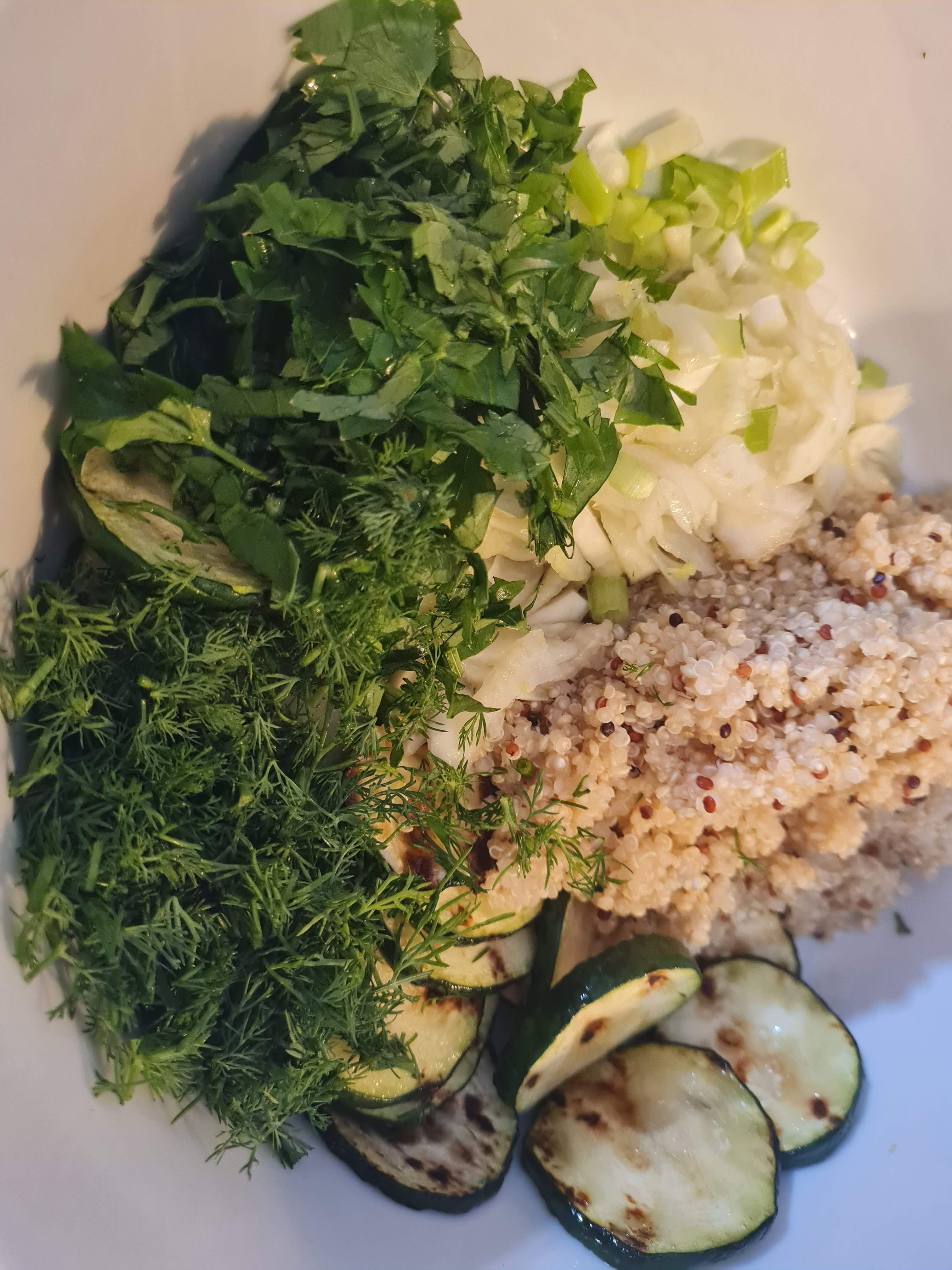 - В голяма купа смесвам охладената и отцедена от излишната вода киноа, изпечените и охладени тиквички, резенето, нарязаните на ситно зелени подправки, настърганата кора на лимона, сокът от половината лимон и нарязания на ситно зелен лук.