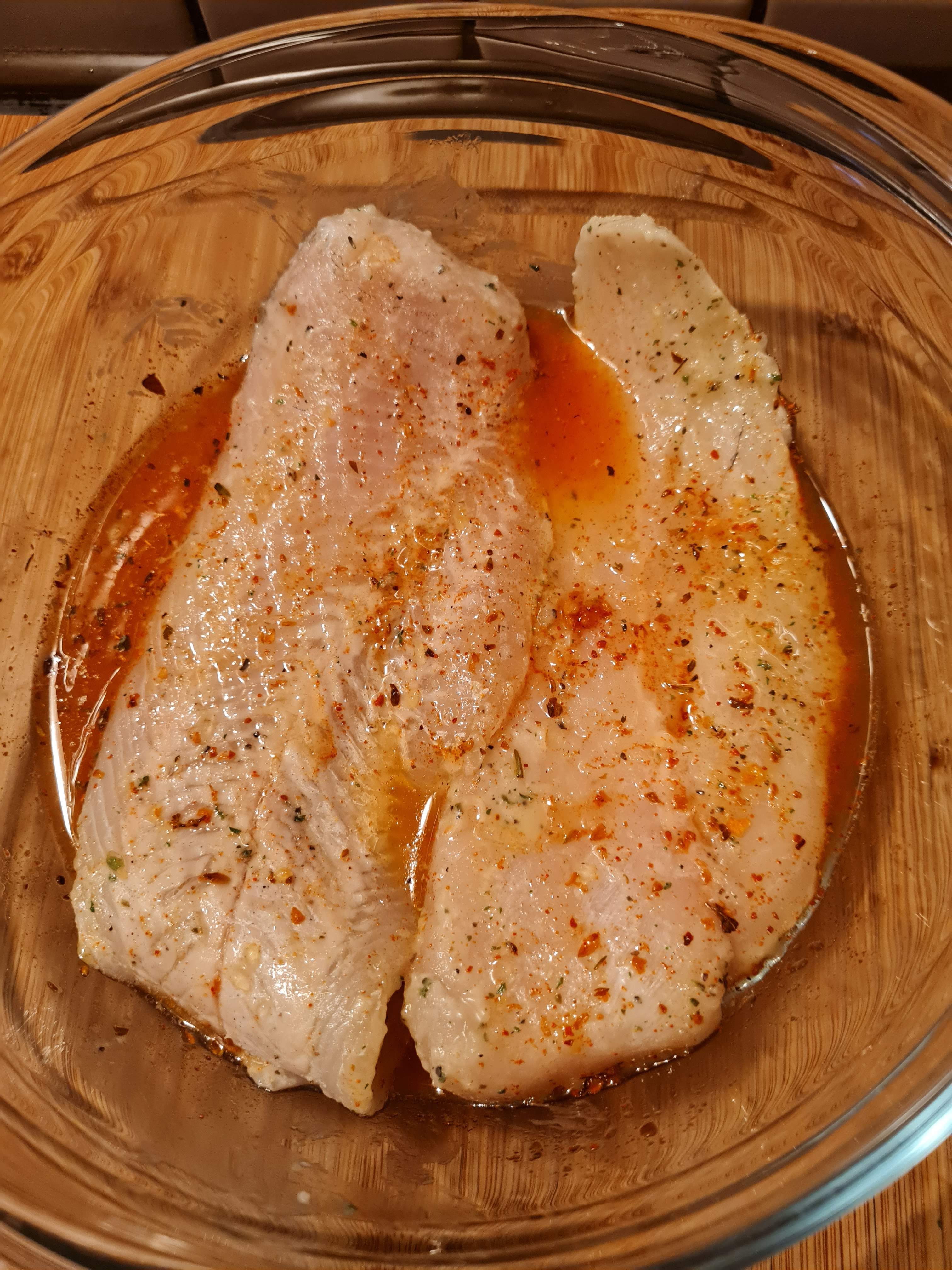 - Един час, преди да приготвя ястието мариновам рибата в сока на лимона, смесен с 25 г от мексиканската подправка и 1 скилидка смлян чесън. Покривам с фолио за свежо съхранение и оставям на студено в хладилник.