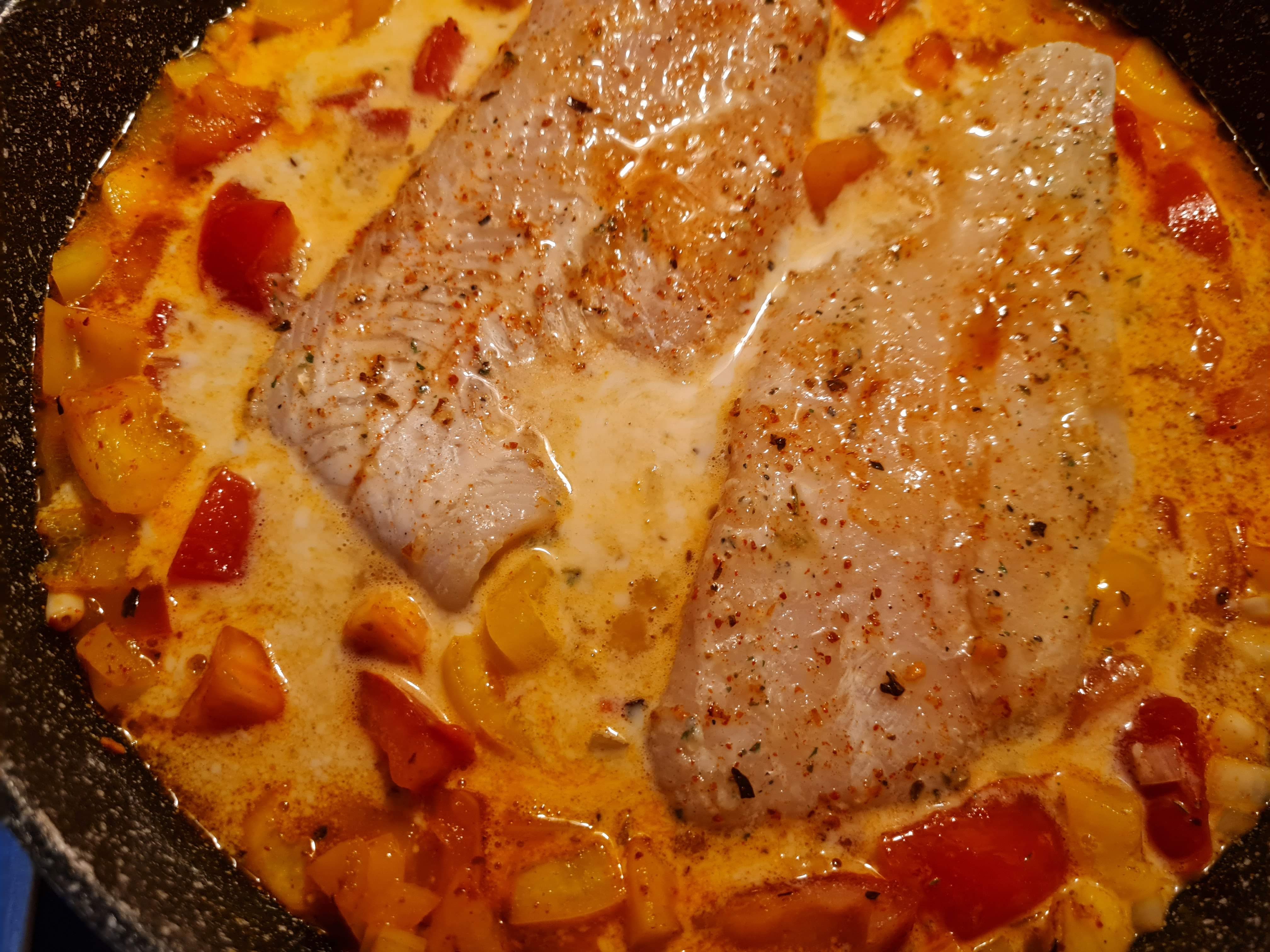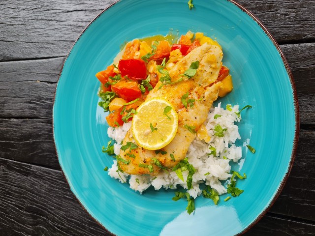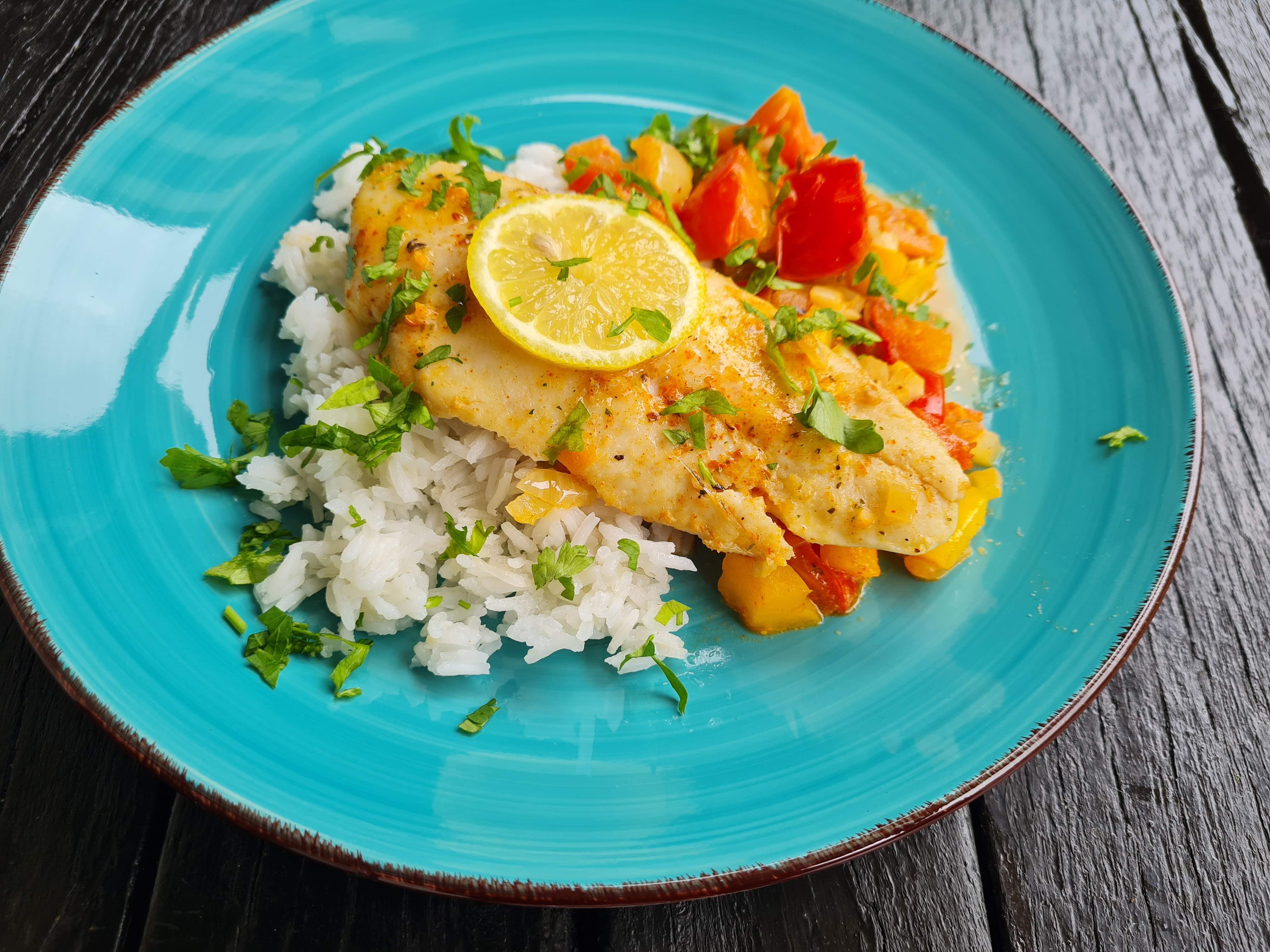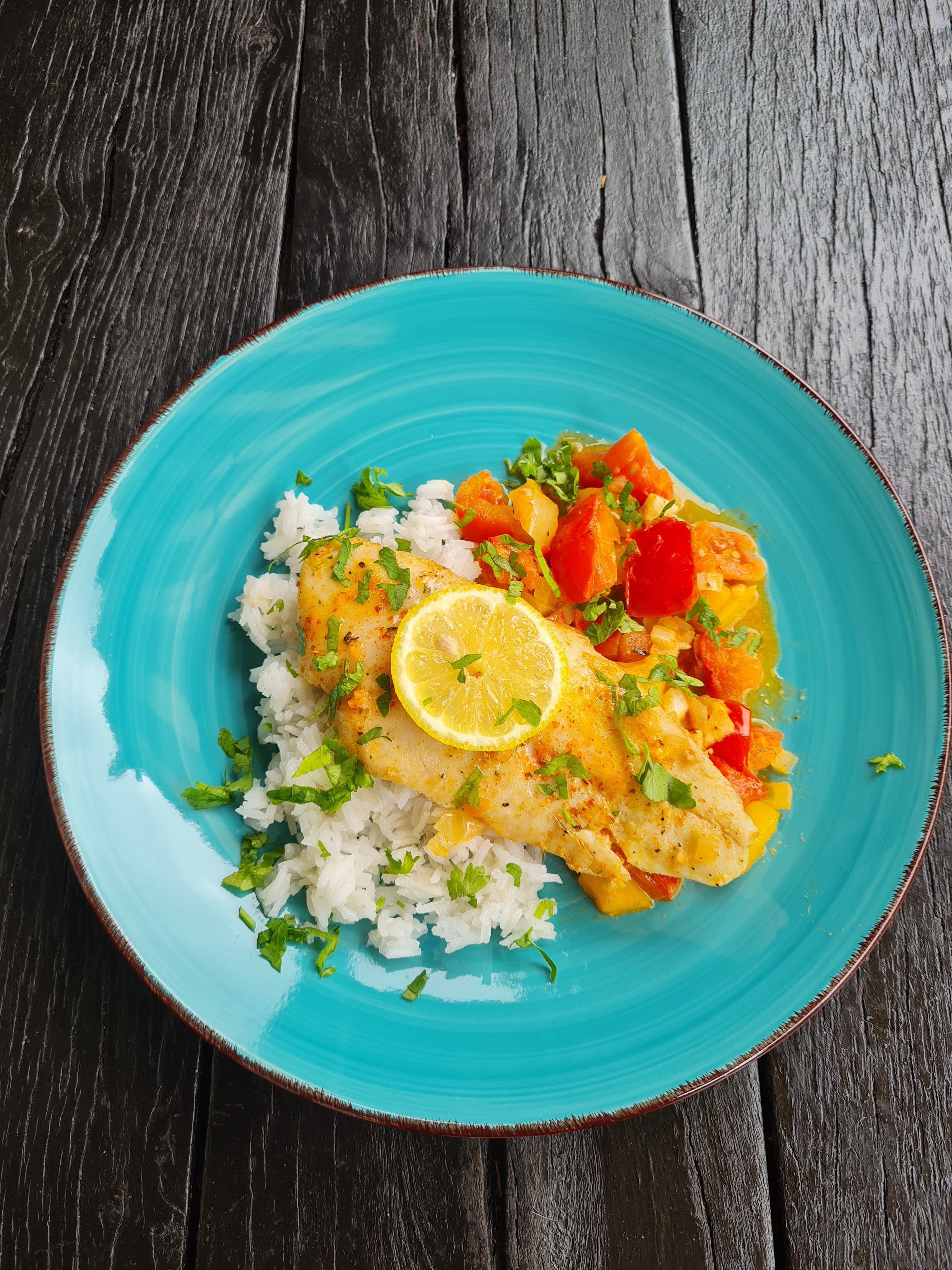 Сервирам рибата върху легло от ориз басмити и добавям сос от чушки и кокосово мляко.